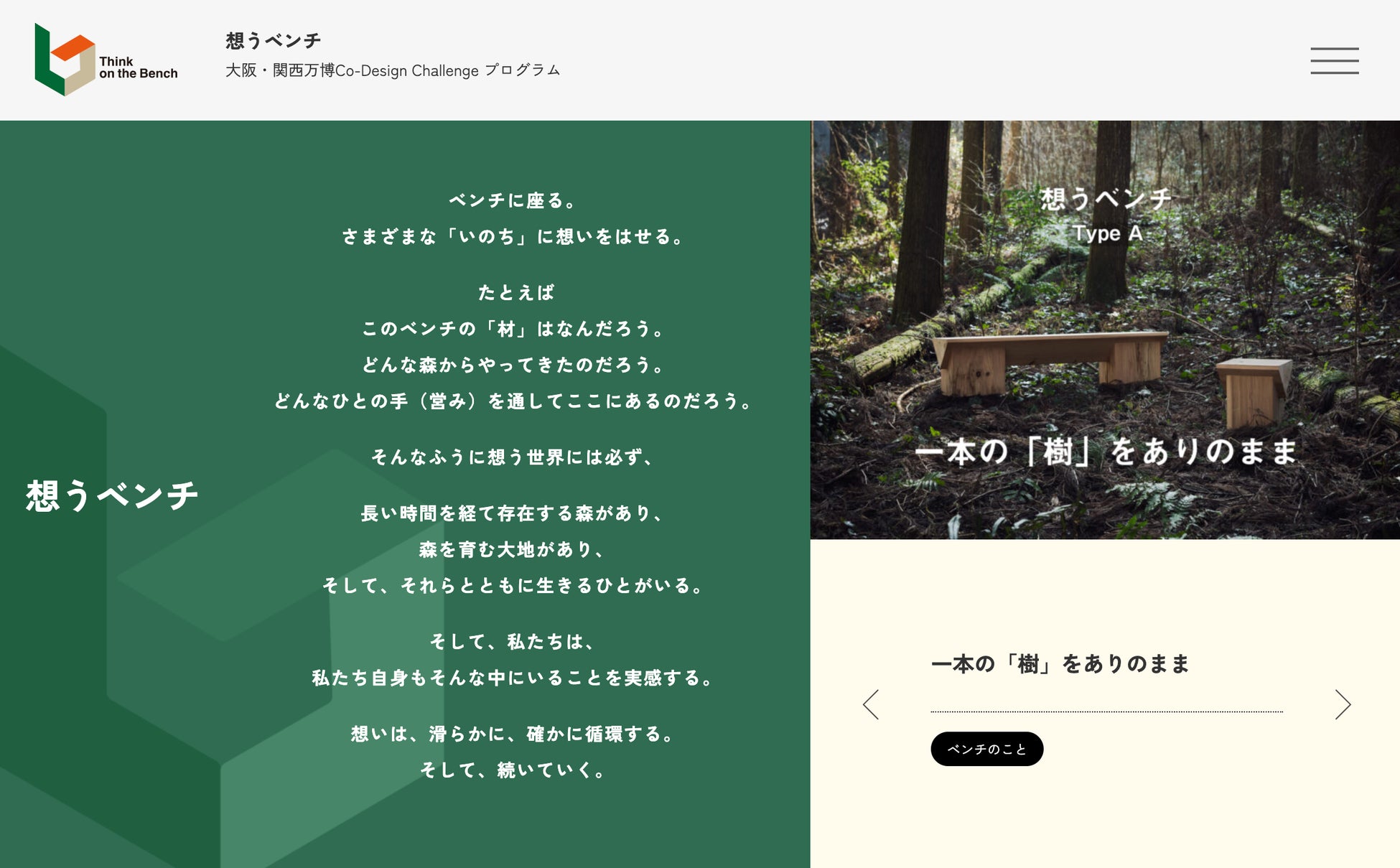 「想うベンチーいのちの循環」プロジェクトは、大阪産材を使ったベンチをつくり、万博に設置、その後は大阪各地で使っていただくプロジェクト(運営:エイチ・ツー・オー リテイリング株式会社)。日本や世界で活躍するデザイナー3名が大阪の森を訪問し地域の製材所と形にしたベンチが完成し、万博会場に設置されました。ベンチにつけられた二次元コードから、大阪府民が「いのち」をテーマに企画・取材から制作まで手がけた記事や、大阪の製材所インタビュー、大阪の森の歴史までを掲載したウェブメディアが見られる仕組みで、万博会場のベンチに座り、森やいのちに想いを馳せる時間をつくります。