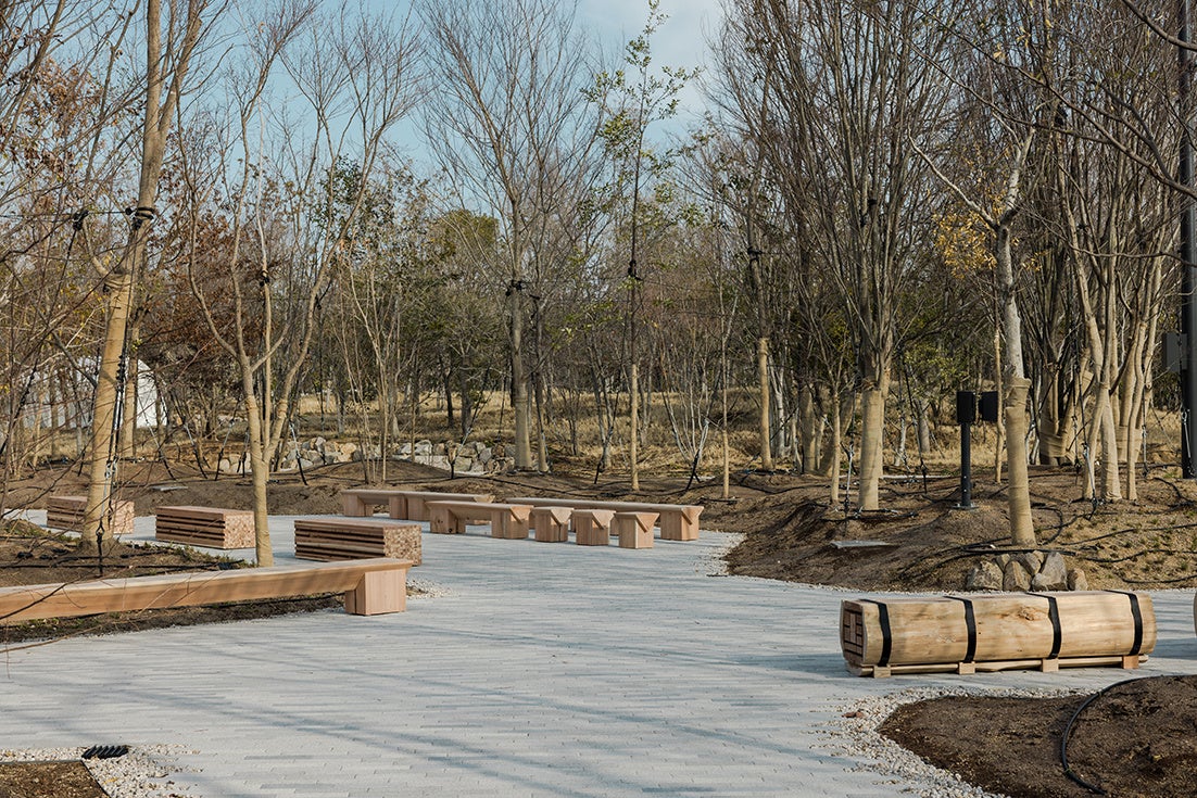 今回、ベンチのデザインを担当したのは、建築やプロダクトなどの分野で国内外で活躍する佐野文彦氏、辰野しずか氏、松井貴氏の3名。万博開始の約1年前、2024年4月に大阪・南河内の森を訪問することからスタートしました。