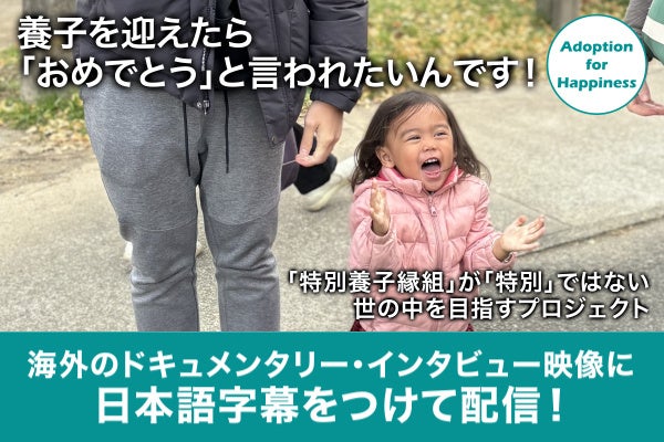 「Adoption for Happiness =アダプション・フォー・ハピネス(幸せになるための特別養子縁組)」プロジェクト(拠点:神奈川県、代表:ネルソン聡子)は、特別養子縁組が「特別」ではなくなる社会を目指し、養子縁組に関する海外のドキュメンタリーや当事者へのインタビュー映像の日本語字幕版制作と配信を行うプロジェクトです。