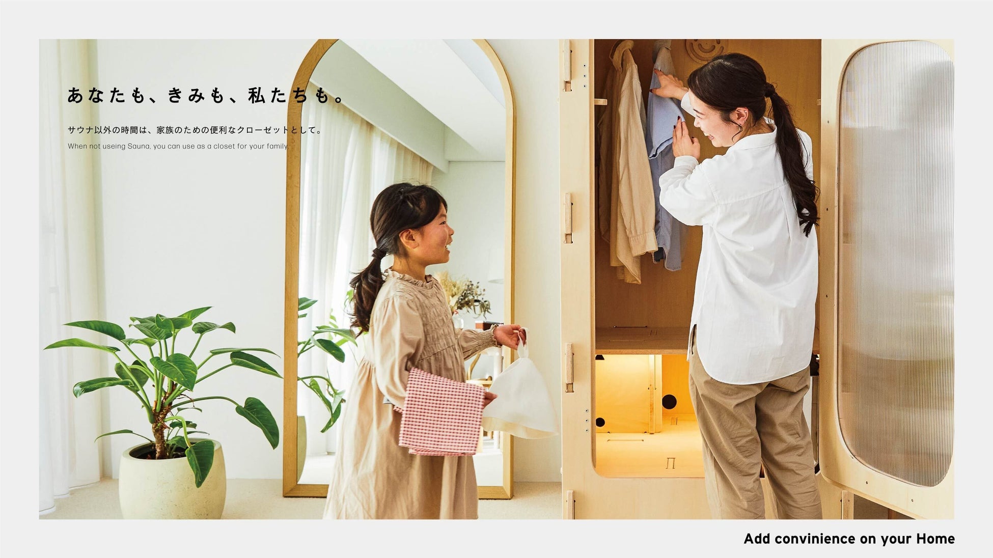 毎日をちょっと特別にする、おうちサウナ。家族みんなで楽しむ時間も、一人でじっくり整う時間も、思いのまま。ぽかぽか温まって、笑顔がふえる。