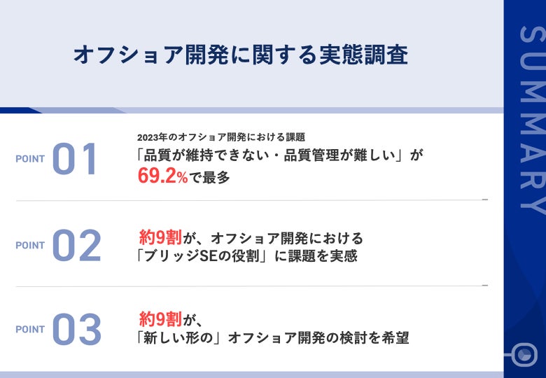 今回の調査では、多くの企業がオフショア開発において品質管理やコミュニケーションの課題に直面していることが明らかになりました。ブリッジSEの役割に対する課題感が強く、技術理解やコミュニケーションの齟齬が主な課題となっています。また、これまでコスト削減のために活用されてきたオフショア開発ですが、円安の進行と、主要なオフショア開発国での経済成長が人件費上昇を招き、かえってコスト高になるリスクも考えられるなど、その費用対効果は再評価の段階にあります。これらの課題を解決する1つの手段として、日本人と外国人エンジニアの両方が所属する企業や、海外拠点に日本人エンジニアがいる企業への委託、オフショア開発支援サービスの利用などが考えられます。これらの方法により、コミュニケーションの効率化と品質管理の向上が期待でき、オフショア開発のリスクを低減できるのではないでしょうか。