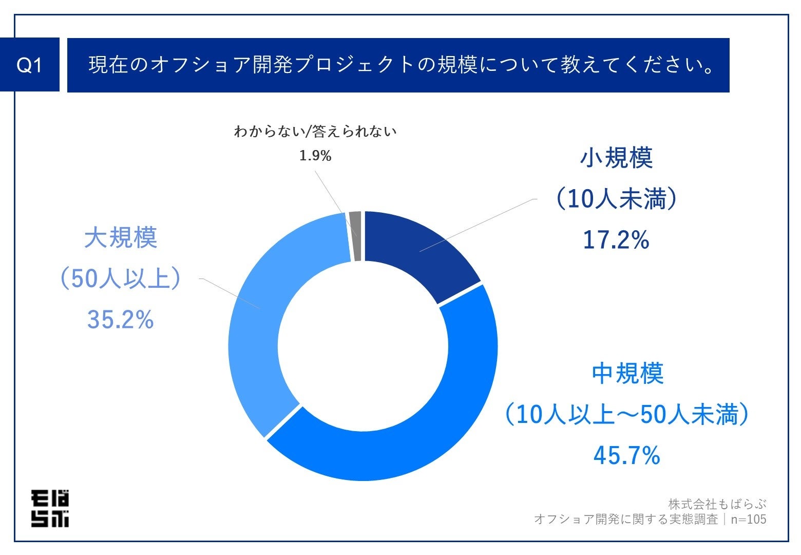 「Q1.現在のオフショア開発プロジェクトの規模について教えてください。」(n=105)と質問したところ、「小規模(10人未満)」が17.2%、「中規模(10人~50人未満)」が45.7%、「大規模(50人以上)」が35.2%という回答となりました。