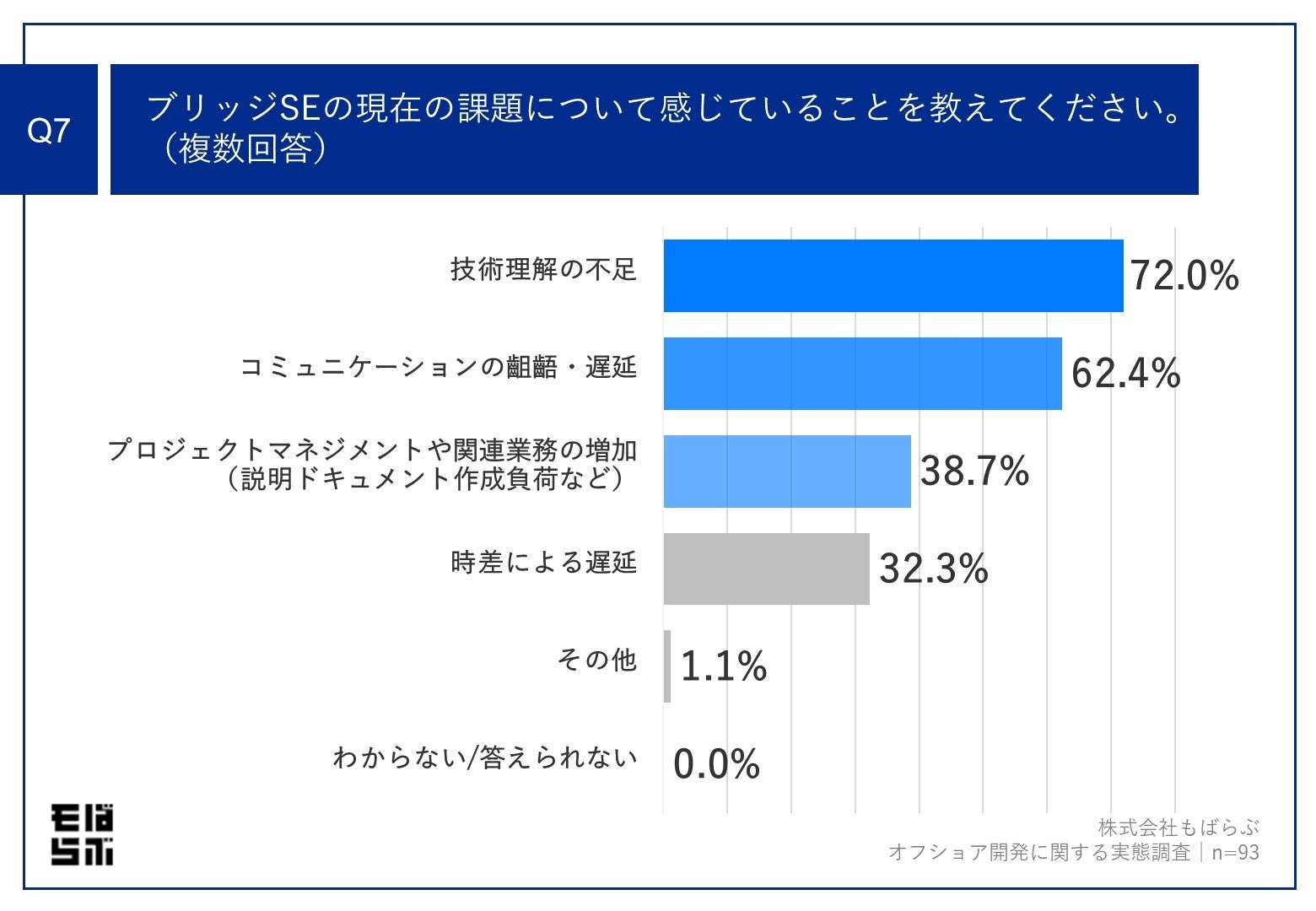 Q6で「頻繁にある」「たまにある」と回答した方に、「Q7.ブリッジSEの現在の課題について感じていることを教えてください。(複数回答)」(n=93)と質問したところ、「技術理解の不足」が72.0%、「コミュニケーションの齟齬・遅延」が62.4%、「プロジェクトマネジメントや関連業務の増加(説明ドキュメント作成負荷など)」が38.7%という回答となりました。