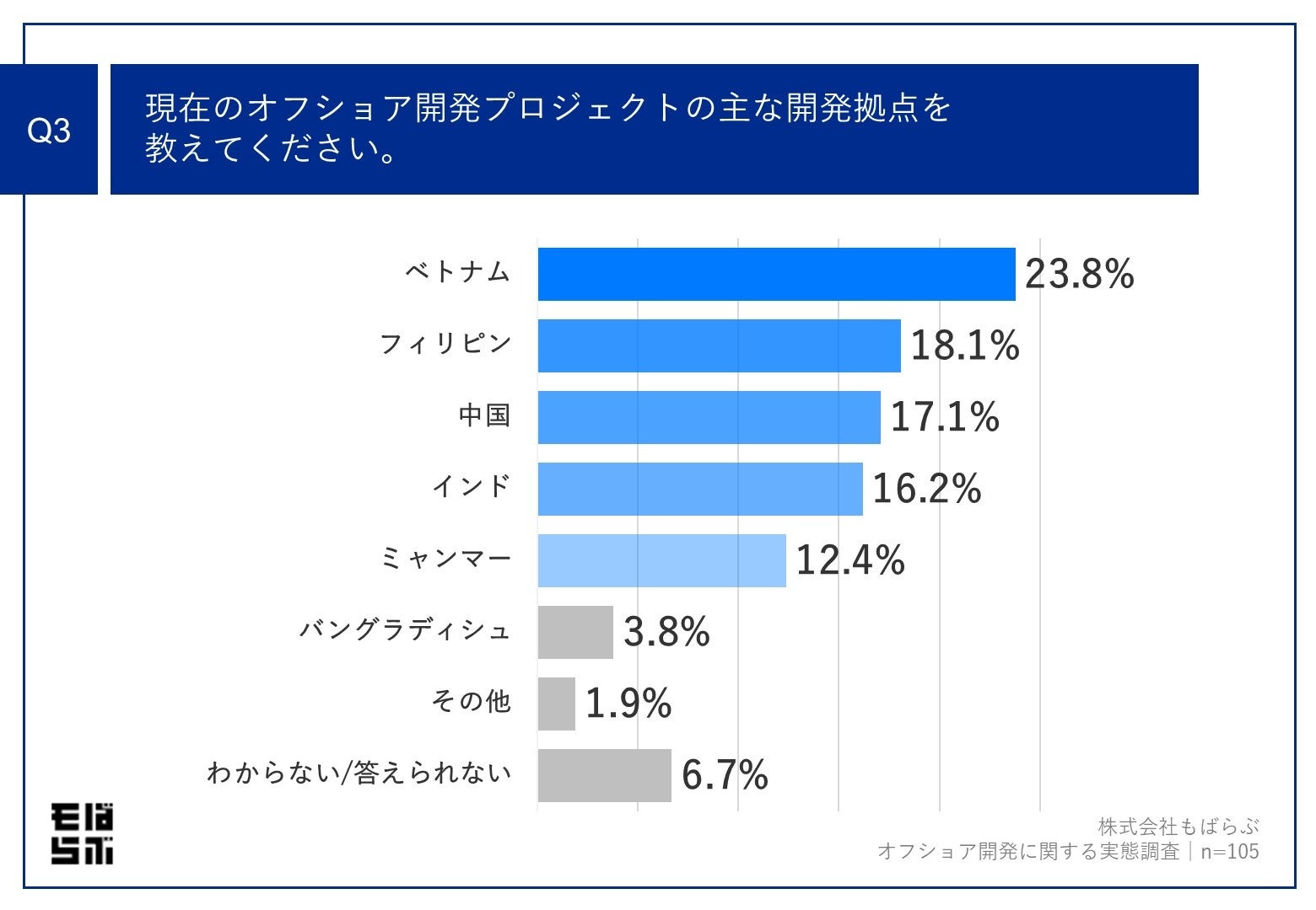 「Q3.現在のオフショア開発プロジェクトの主な開発拠点を教えてください。」(n=105)と質問したところ、「ベトナム」が23.8%、「フィリピン」が18.1%、「中国」が17.1%という回答となりました。