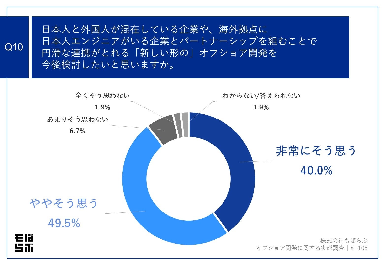 「Q10.日本人と外国人が混在している企業や、海外拠点に日本人エンジニアがいる企業とパートナーシップを組むことで円滑な連携がとれる、「新しい形の」オフショア開発を今後検討したいと思いますか。」(n=105)と質問したところ、「非常にそう思う」が40.0%、「ややそう思う」が49.5%という回答となりました。