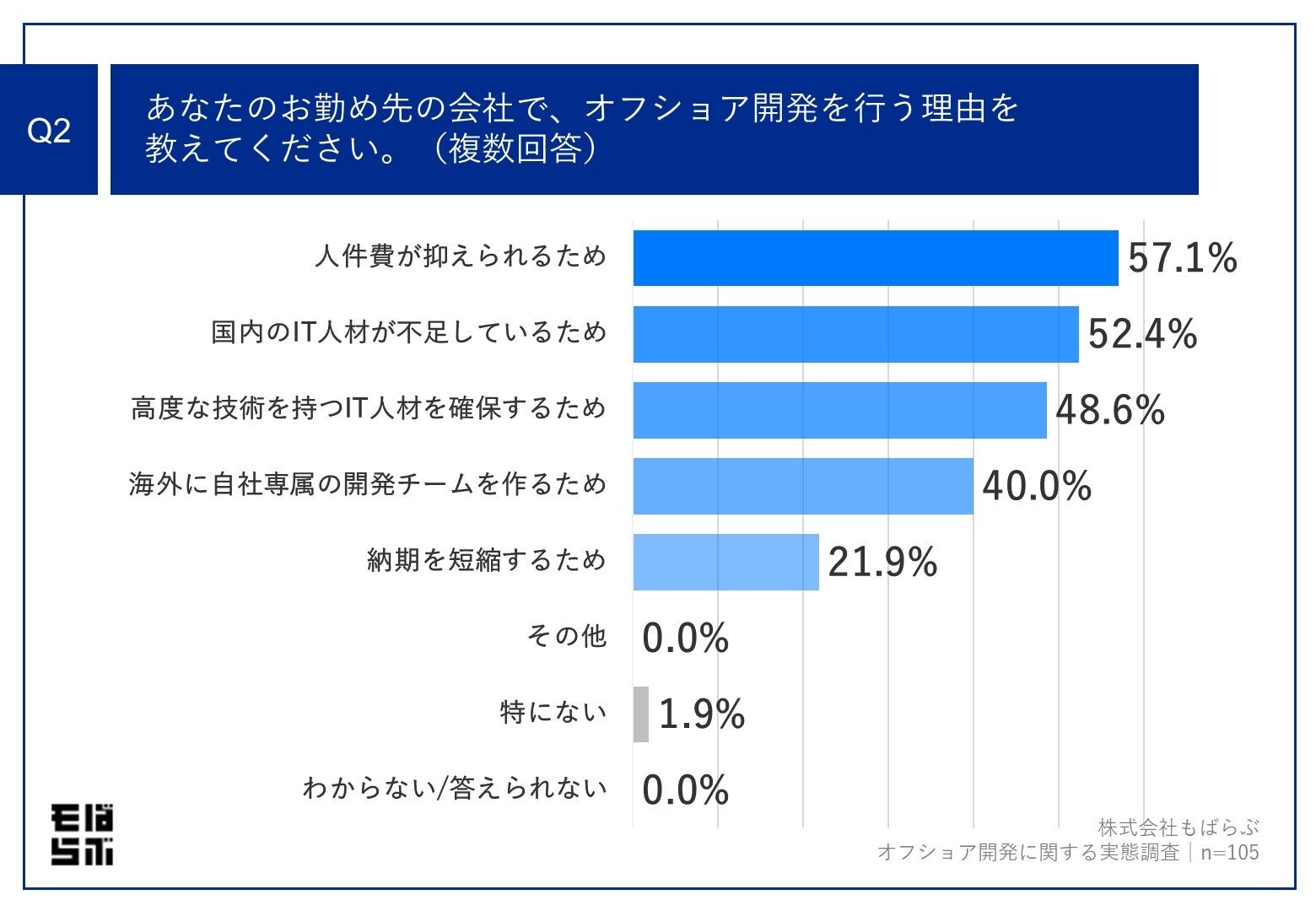 「Q2.あなたのお勤め先の会社で、オフショア開発を行う理由を教えてください。(複数回答)」(n=105)と質問したところ、「人件費が抑えられるため」が57.1%、「国内のIT人材が不足しているため」が52.4%、「高度な技術を持つIT人材を確保するため」が48.6%という回答となりました。