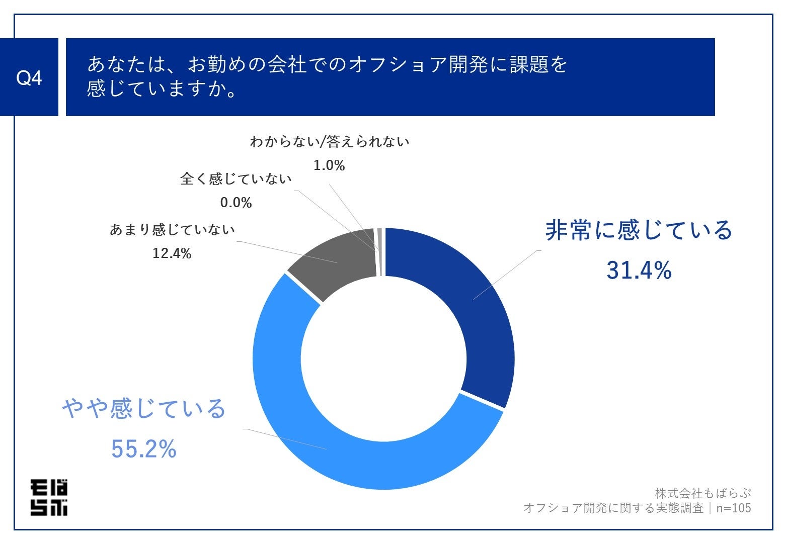 「Q4.あなたは、お勤めの会社でのオフショア開発に課題を感じていますか。」(n=105)と質問したところ、「非常に感じている」が31.4%、「やや感じている」が55.2%という回答となりました。