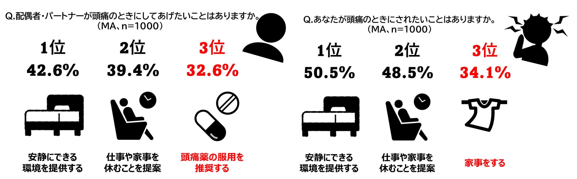 頭痛でつらいとき、パートナーにしてほしいことを聞いたところ、1位「安静にできる環境を提供(50.5%)」、2位「仕事や家事を休むように提案(48.5%)」、3位「家事をする(34.1%)」と回答しました。頭痛でつらそうなときにパートナーにしてあげていることを聞いたところ、1位2位は同様で3位「薬の服用を推奨する(32.6%)」と回答に差がみられました。第1弾の調査結果にもあるように、頭痛もちの人は約8割が頭痛薬を飲んで頭痛に対処しています。頭痛薬は飲んでいる前提で、パートナーには生活する上でのサポートをしてもらえるとありがたいと感じる人が多そうです。