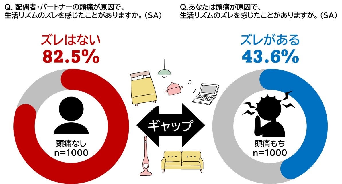 前回の調査では、頭痛もちではない人の約8割が、頭痛もちを「理解したい」と考えている一方で、頭痛もちの約2人に1人は「共有しない」とコミュニケーションギャップがあることが明らかになりました。そこで、実際の生活においてズレを感じたことがあるのかを聞きました。その結果、頭痛もちでない人の8割(82.5%)が生活リズムのズレはないと回答した一方で、頭痛もちの約2人に1人(43.6%)はズレがあると回答しました。