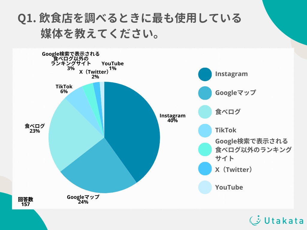 ショート動画SNSの運用やインフルエンサーキャスティングを行う株式会社Utakata(https://utakata.co.jp/)は、Z世代(1996年から2012年生まれ)の男女157名を対象に、「飲食店を調べるために使用する媒体」に関する調査を実施いたしましたので、お知らせいたします。