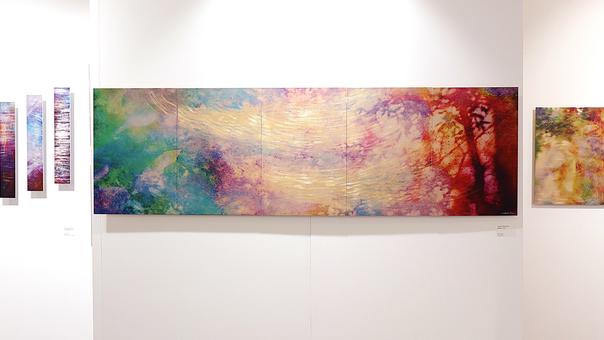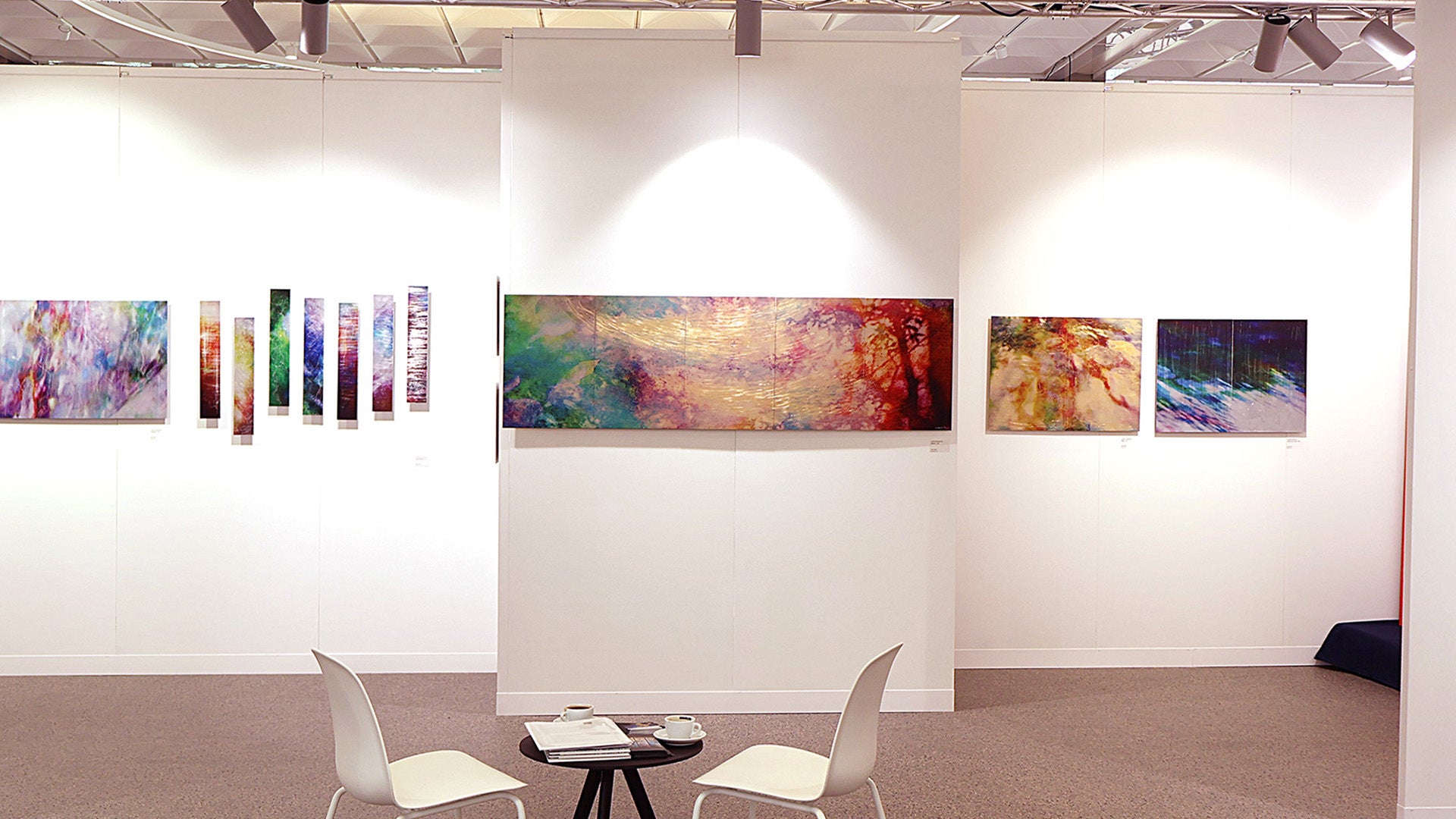 まず注目を集めたのはブースの中心に据えられた横幅2mの大作《夢想》でした。ドビュッシーの曲からインスピレーションを受けたこの作品は真鍮板をベースにしており、傷によって付けられた描線が繊細な金色の輝きとなって通路を歩く人の目を惹きつけます。この若松が独自に生み出した金属傷による表現は「見たことのない技術がとても興味深い」「ヨーロッパのインテイアに合っている」「壊れて出来る傷が美しさに変わる」といった多くの好意的なコメントをいただくことができ、続けて他の作品を鑑賞する流れを作っていました。