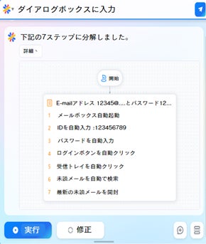 ダイアログボックスに自然言語で、業務内容を入力することで、AIがその通りにシナリオ作成から業務の自動化までしてくれます。