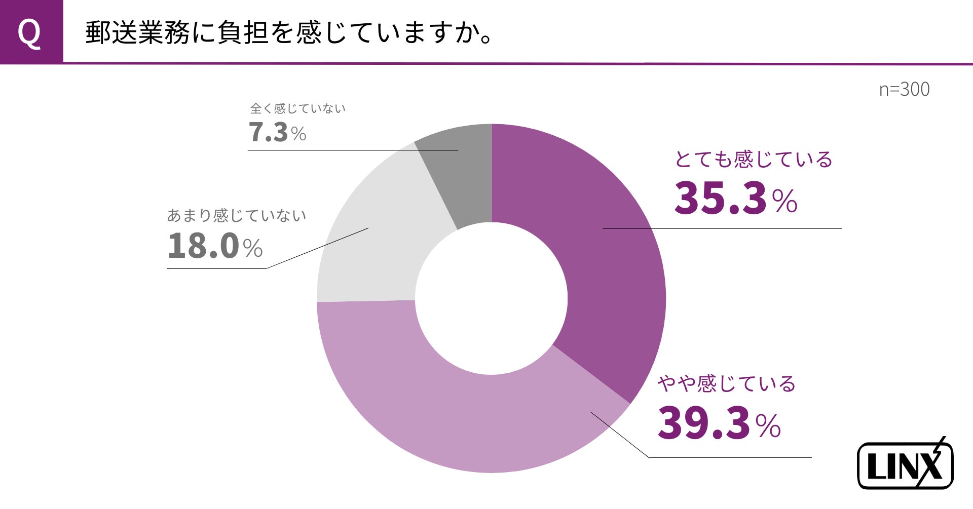 個人宛ての郵送業務に携わる方に、業務の負担を尋ねたところ、約75%の人が負担を感じていることがわかりました(n=300)。