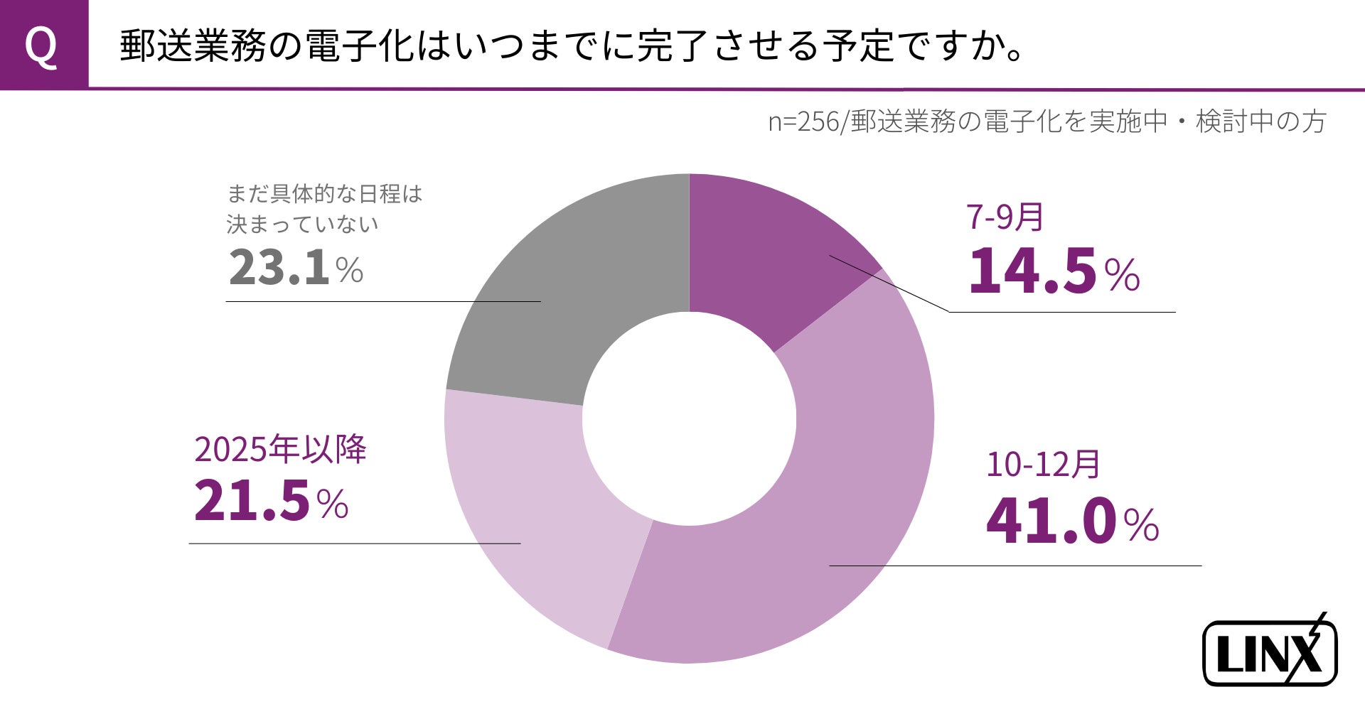 電子化を実施または検討中の方に完了予定時期を尋ねたところ、郵便料金の値上げが実施される10月までに完了させる予定の企業は14.5%でした(n=256/郵送業務の電子化を実施中・検討中の方)。