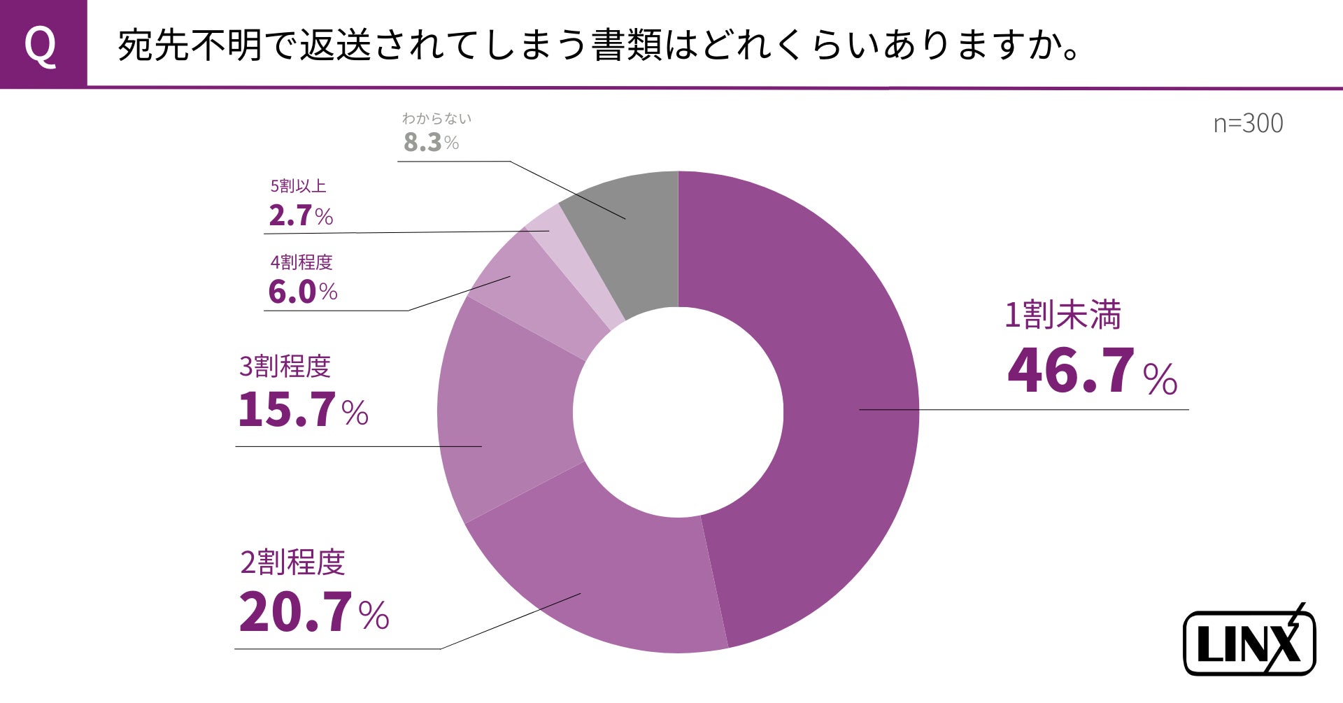 また、多くの企業で転居先不明で返送されてしまう書類が存在することがわかりました。書類の不着により、送料が無駄になるだけでなく、顧客コミュニケーションの機会損失や重要書類が通知できないといった問題が発生しているといえます(n=300)。