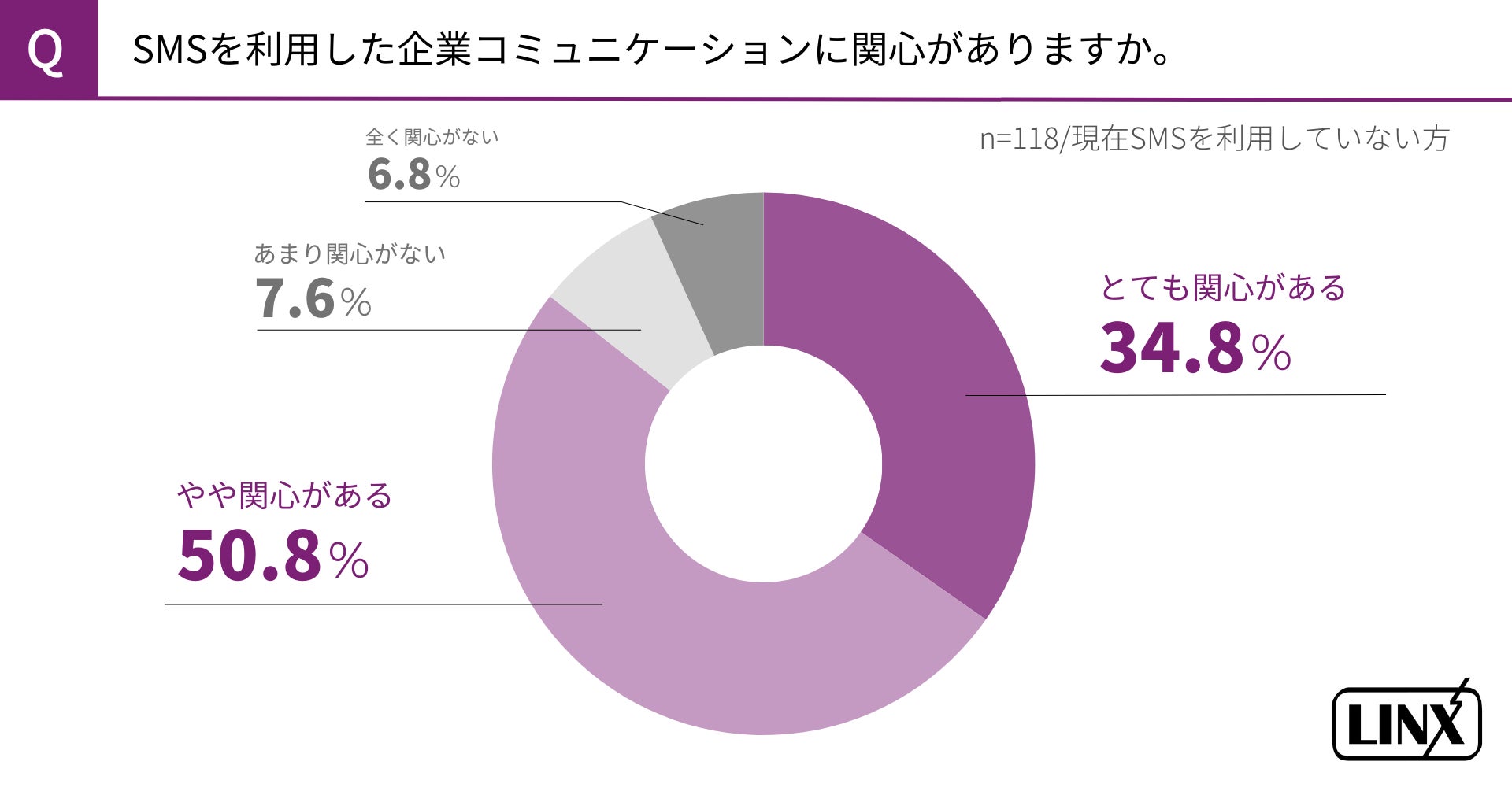 Eメールに次ぐ電子化ツールとして利用されているSMSへの関心度合いについて、現在SMSを利用していない方に尋ねたところ、85.6%の人が関心があると回答しました(n=118/現在SMSを利用していない方)。