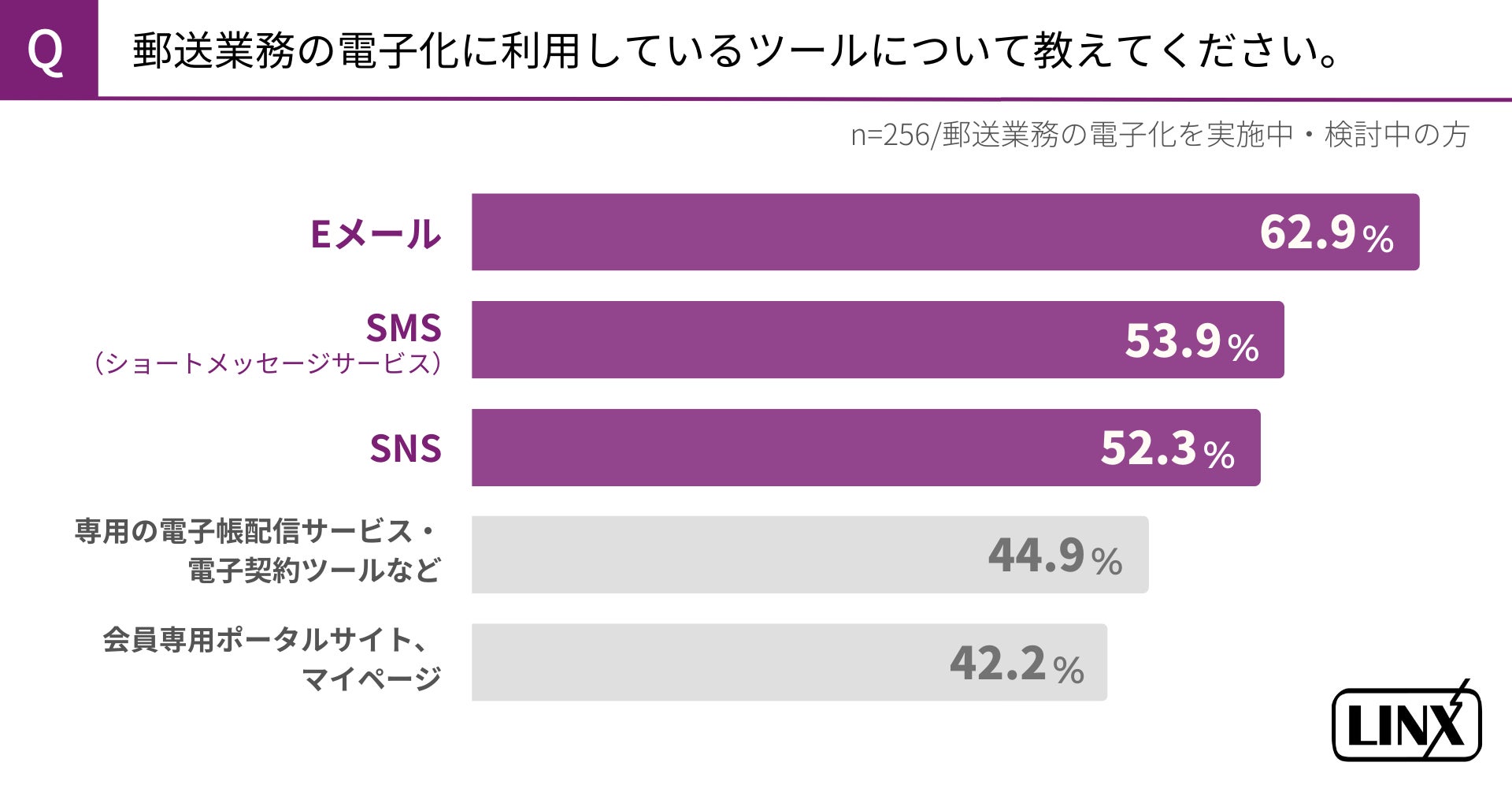 電子化を実施または検討中の方に、郵送業務の電子化ツールの利用意向について尋ねたところ、EメールについでSMS、SNSを利用していることがわかりました(n=256)。