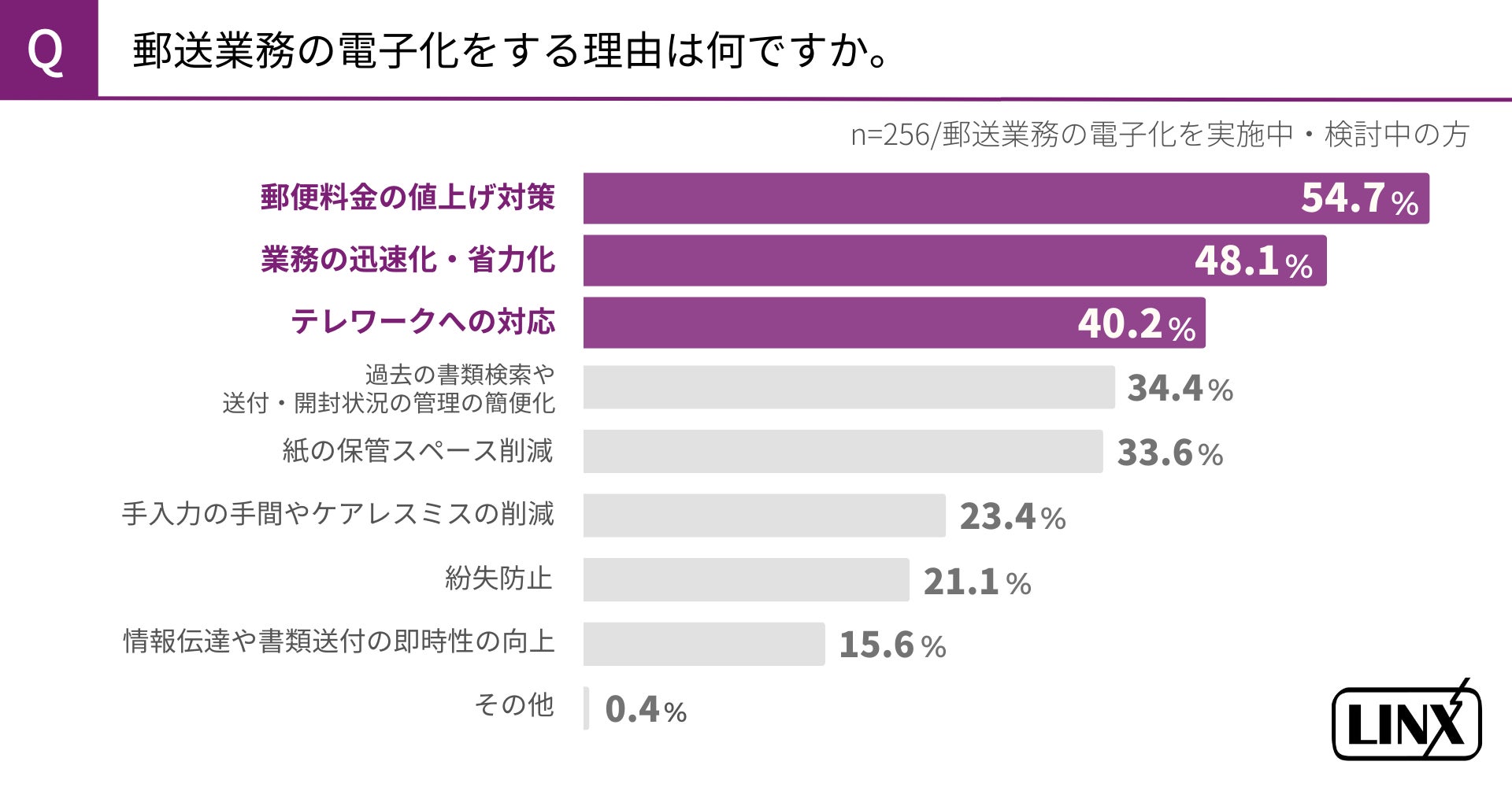 電子化をする理由は、1位「郵便料金の値上げ対策」、2位「業務の迅速化・省力化」、3位「テレワークへの対応」