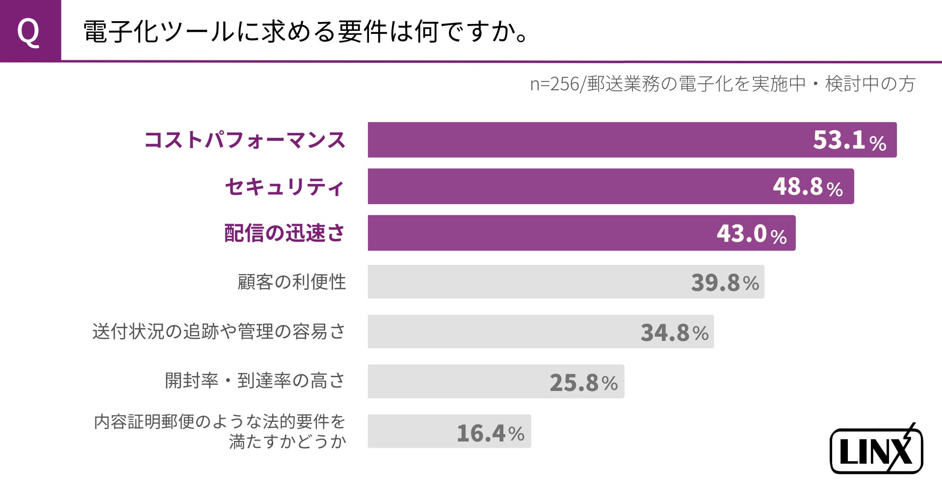 郵送業務の電子化ツールへ求めることは何か尋ねたところ、セキュリティやコストパフォーマンスといった基本的な事項に加え、配信の迅速さ、送付状況の追跡や管理の容易さなど、郵送では実現できない要素も見て取れました(n=256/郵送業務の電子化を実施中・検討中の人)。