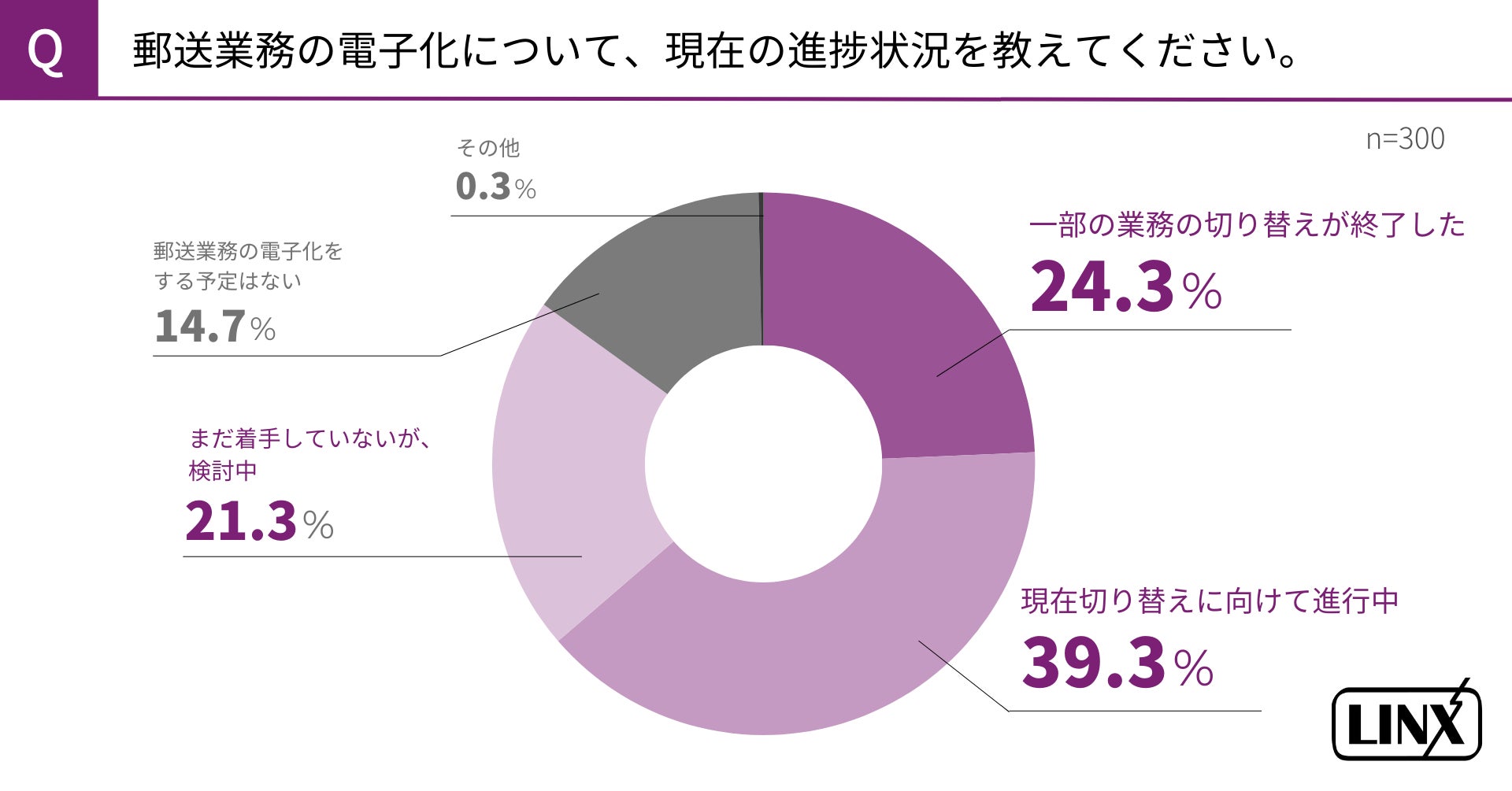 郵送業務の電子化の進捗状況を尋ねたところ、一部業務の切り替えが終了した企業は24.3%、現在切り替えに向けて進行中の企業は39.3%でした。14.7%の企業は電子化を予定していないと回答しました(n=300)。