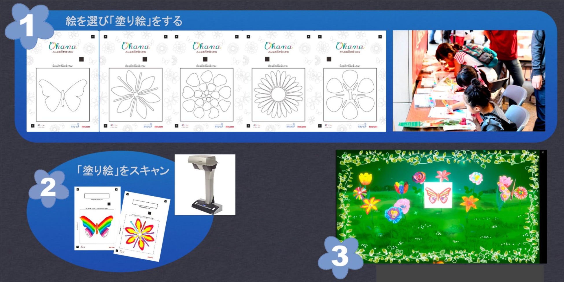 この体験型コンテンツでは、参加する子供達が好きなお花の塗り絵シートに自由に自分の色を描き、その描いた花をスキャナーで読み込むことで、デジタルのお花畑にツルが伸び、お花が咲くという体験が楽しめます。