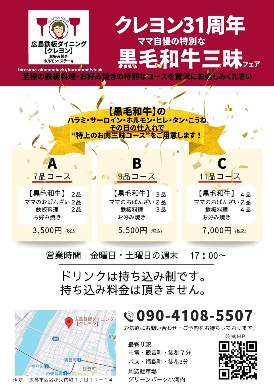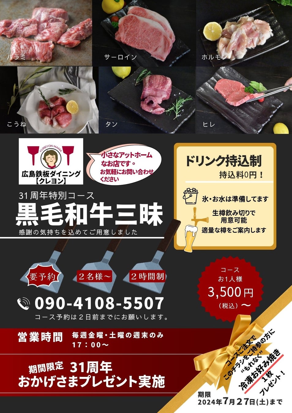 広島鉄板ダイニング クレヨン(店舗:広島市西区小河内町1-11-14 代表:清水智子)は、2024年6月15日で31周年を迎えました。お陰さまの感謝の気持ちを込めて、品質自慢の黒毛和牛を驚きの価格でふんだんに味わえる「黒毛和牛三昧コース」を2024年7月5日より提供を開始いたします。コース内容は添付のチラシを拡大してご覧下さい。