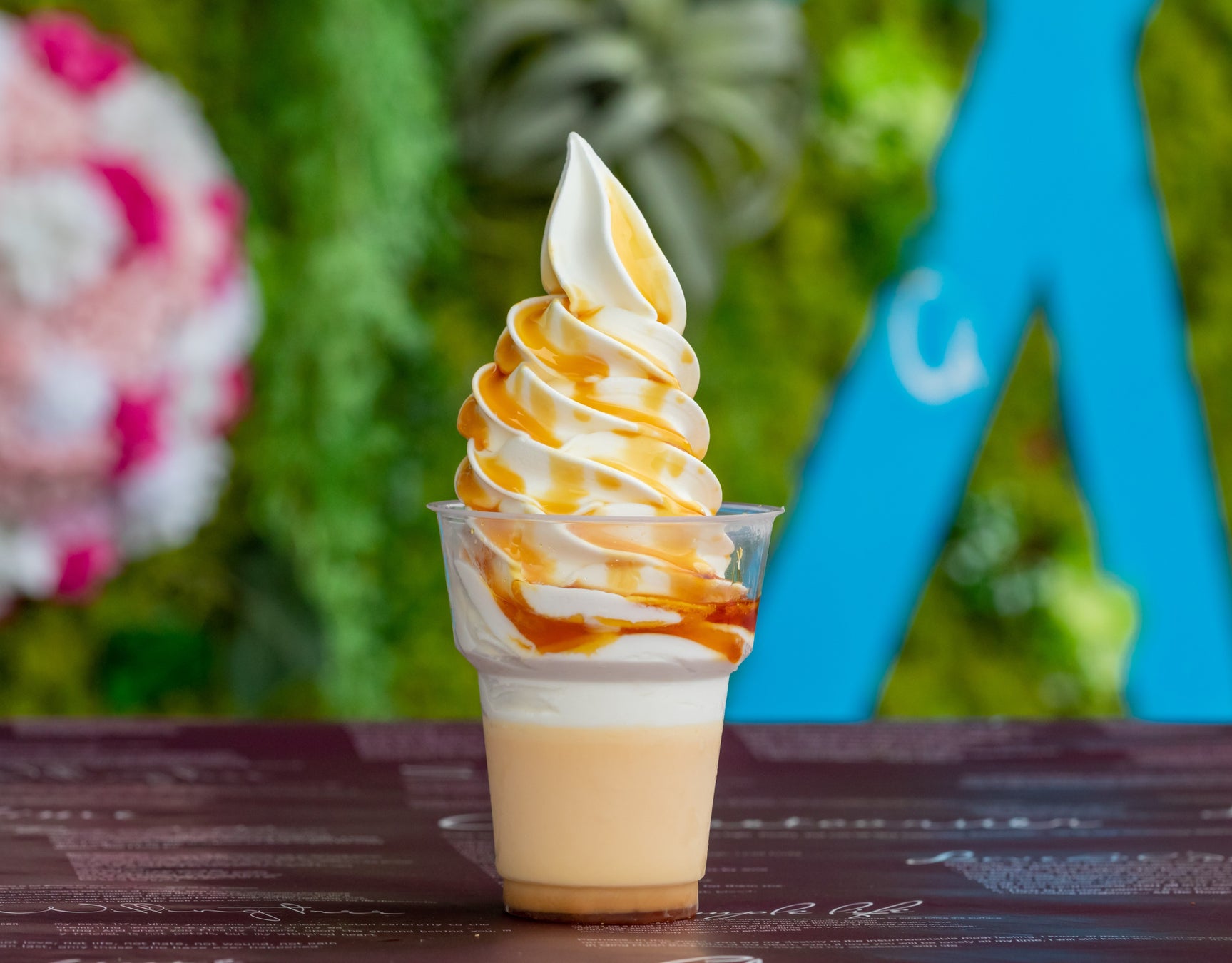 武雄温泉物産館のスイーツテイクアウトコーナーでは、「たけお温泉ぷりん」をベースにした「プリンソフト」も大人気。