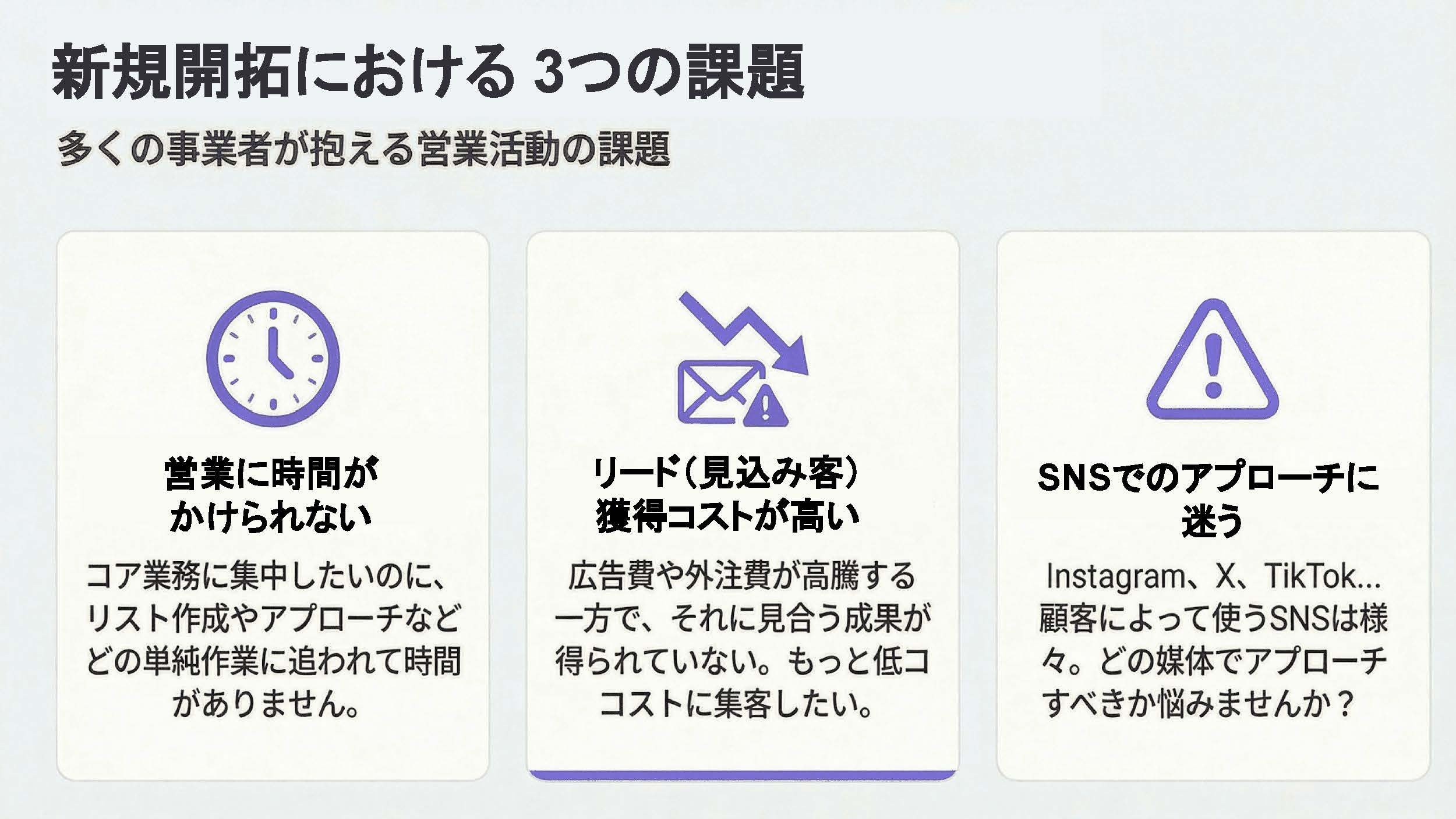 多くの企業、特に地域に根差したサービスを展開する事業者にとって、新規顧客の開拓は重要な経営課題です。しかし、従来の営業手法では、「Googleマップで一軒ずつ店舗情報を検索しリスト化するのに膨大な時間がかかる」「画一的なDMでは返信率が低い」「システムでの大量送信はスパムと判定されるリスクがある」といった多くの課題を抱えていました。株式会社スゴヨクは、これらの課題を解決し、より多くの事業者がコア業務に集中できる環境を創出するため、Leadgramを開発いたしました。