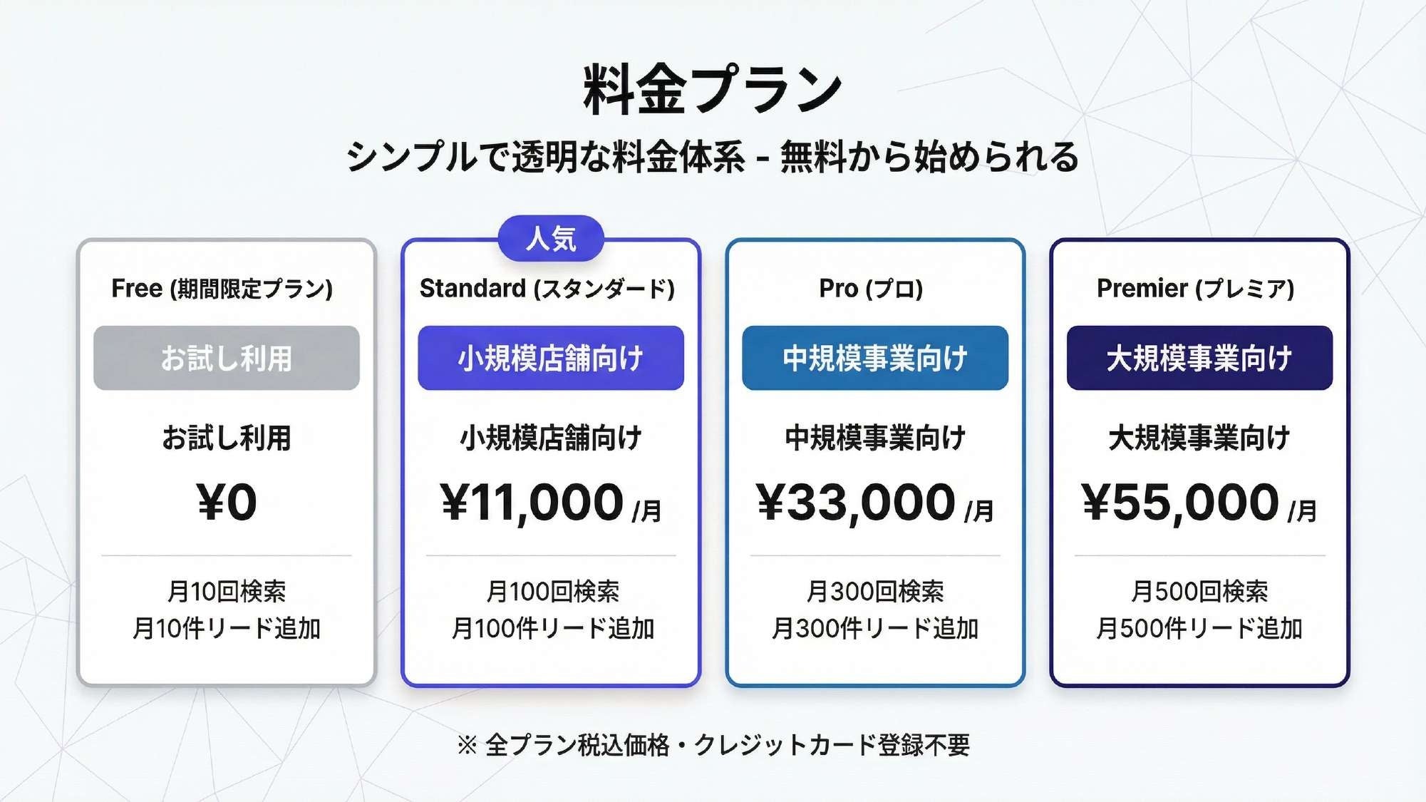 月額55,000円(税込) (月500回の検索、月500件のリード追加) |