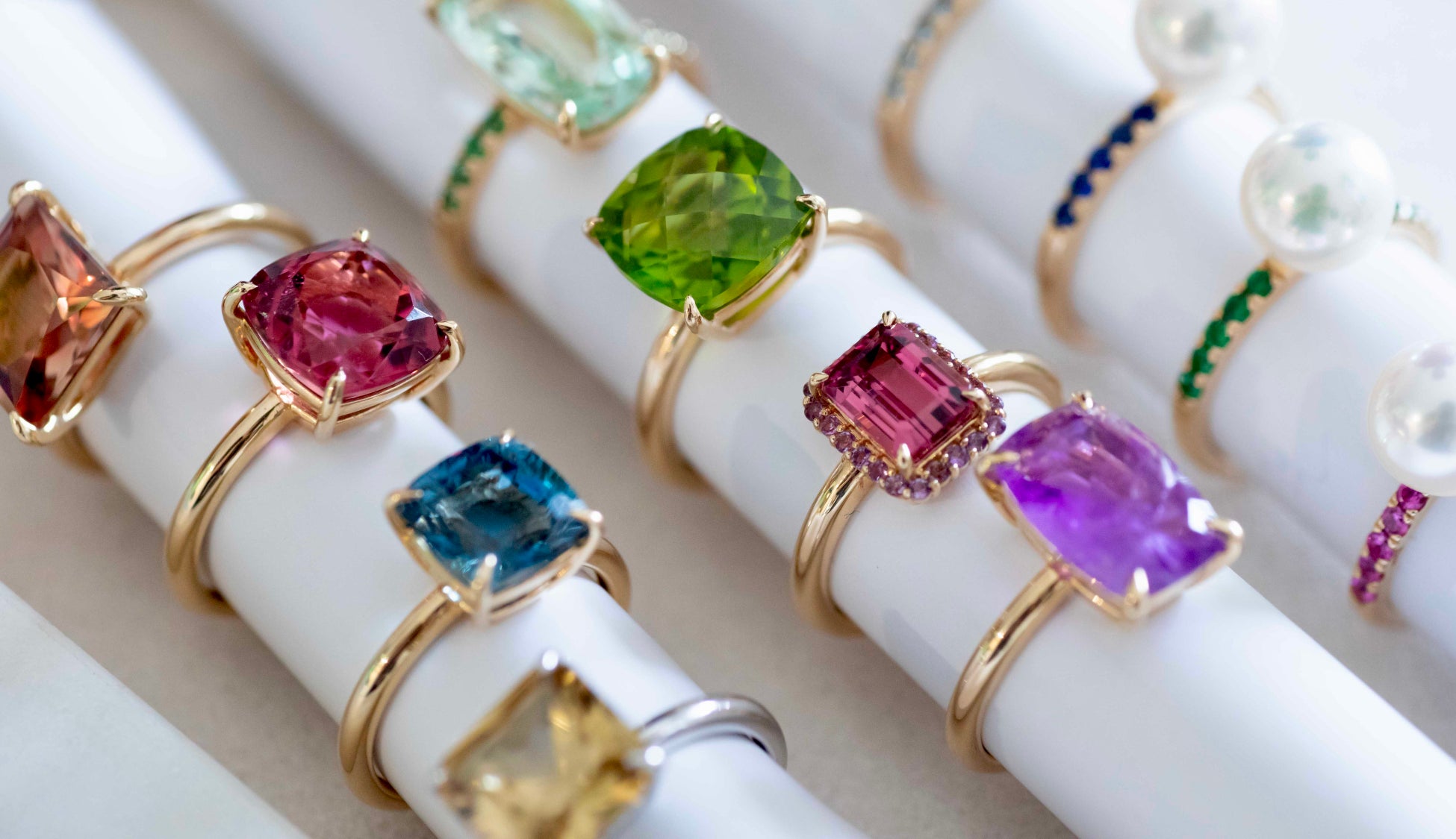 希少な宝石であるスフェーン、ペリドット、イエロージルコンなど一点物のデザインリングが登場します。
