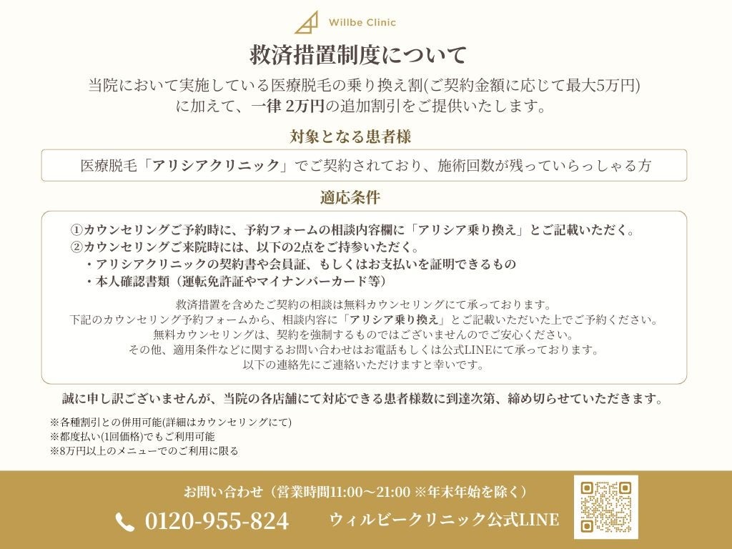 大手医療脱毛クリニックの倒産に関する声明と救済措置について【美容皮膚科 Willbe Clinic(ウィルビークリニック)】