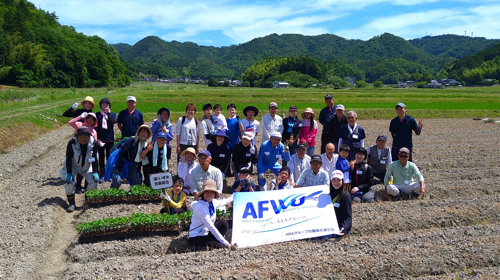 農事組合法人いずみ営農組合(事業所:兵庫県丹波篠山市泉1089-1、組合長:小嶋美則、以下「いずみ営農組合」)は、6月15日(土)、兵庫県丹波篠山市泉にて、老舗黒豆専門店の株式会社小田垣商店(本社:〒669-2323 兵庫県丹波篠山市立町9番地、代表:小田垣 昇、以下「小田垣商店」)、ANAグループ労働組合連合会(事務局:東京都大田区羽田空港3-3-2、会長:白石 哲也、以下「ANAグループ」)と連携し、丹波篠山黒枝豆の植付けを行いました。