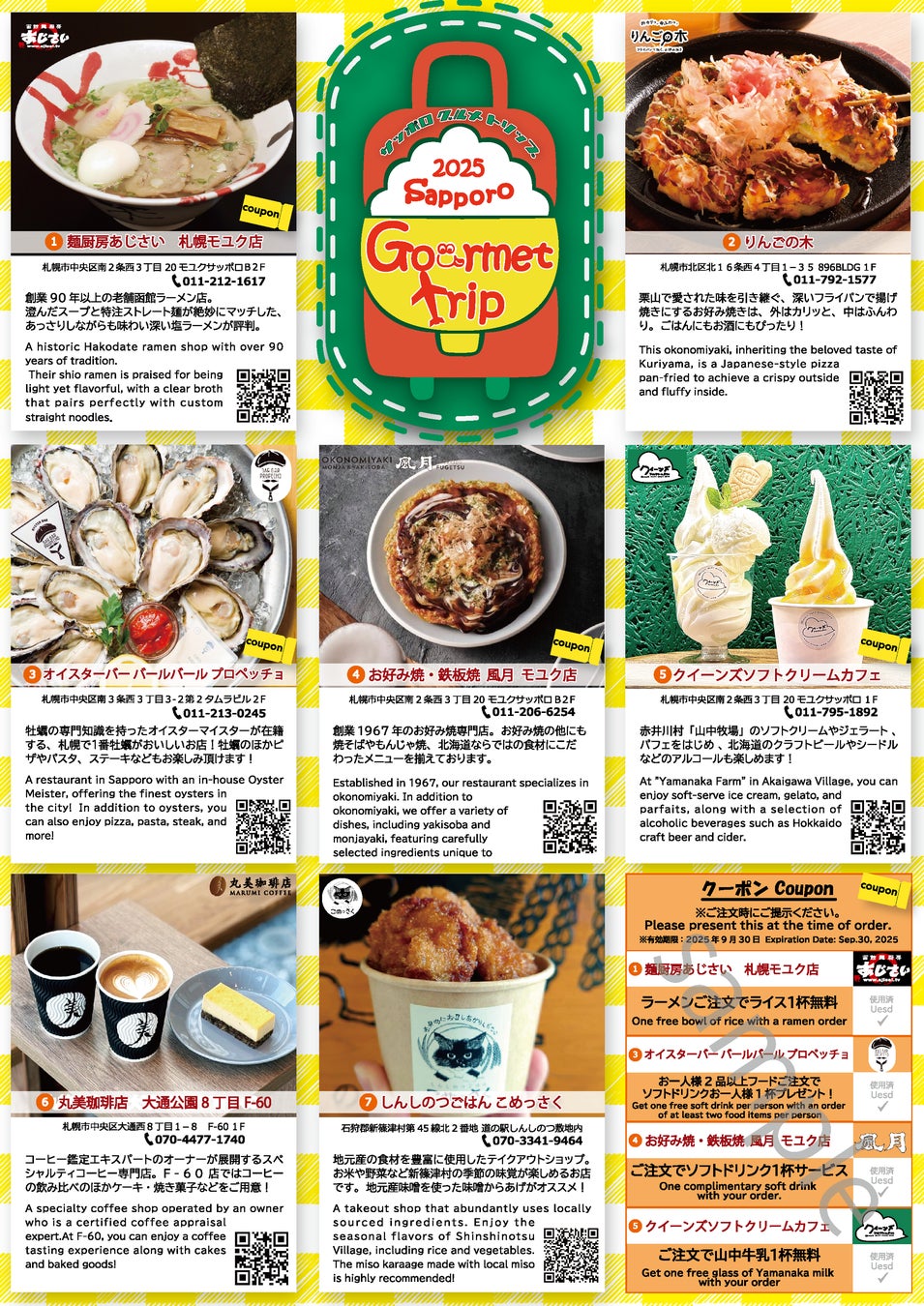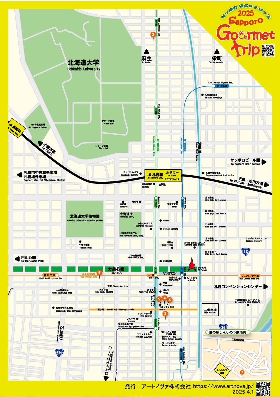 アートノヴァ株式会社(北海道札幌市東区、代表取締役:河井崇友)は、札幌市内の約130のホテルで配布するグルメマップ「Sapporo Gourmet Trip」を2025年4月1日(火)に発行し、観光客の皆様に上質な食体験を提供することを目指します。初回は、札幌市内や近郊の有名店および隠れた穴場の飲食店7店舗を紹介し、4店舗のクーポンも掲載します。また、裏面には掲載店舗や札幌市内中心部の観光地の位置が一目で分かるマップが掲載されています。今後は、拡大版の発行も検討しており、掲載を希望される店舗がございましたら、担当者までご連絡ください。
