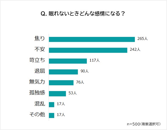 なかなか眠れないときにどんな感情になるかという質問には、「焦り」「不安」と答えた人が多くなっています。「朝まで眠れなかったらどうしよう」「睡眠不足で仕事に支障が出たら困る」と考える人が多いのでしょう。