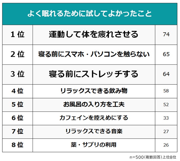 最後に「よく眠れるために試してよかった方法」を聞いたところ、1位は「運動して体を疲れさせる(74人)」です。2位「寝る前にスマホ・パソコンを触らない(65人)」、3位「寝る前にストレッチする(64人)」が続きます。