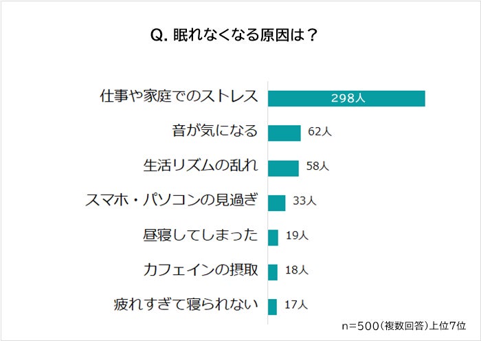 眠れなくなる原因の圧倒的1位は「仕事や家庭でのストレス(298人)」で、全体の6割を占めました。2位「音が気になる(62人)」、3位「生活リズムの乱れ(58人)」、4位「スマホ・パソコンの見過ぎ(33人)」が続きます。