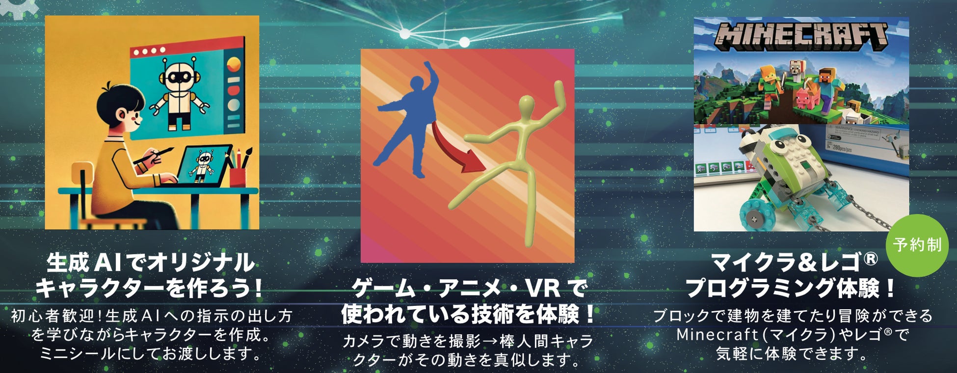 さらに、生成AIへの指示の出し方を学びながらキャラクターを作成し、その場でキャラクターシールがもらえる体験コーナーや、学生に大人気のゲーム機が当たるクイズコーナーも設けております。