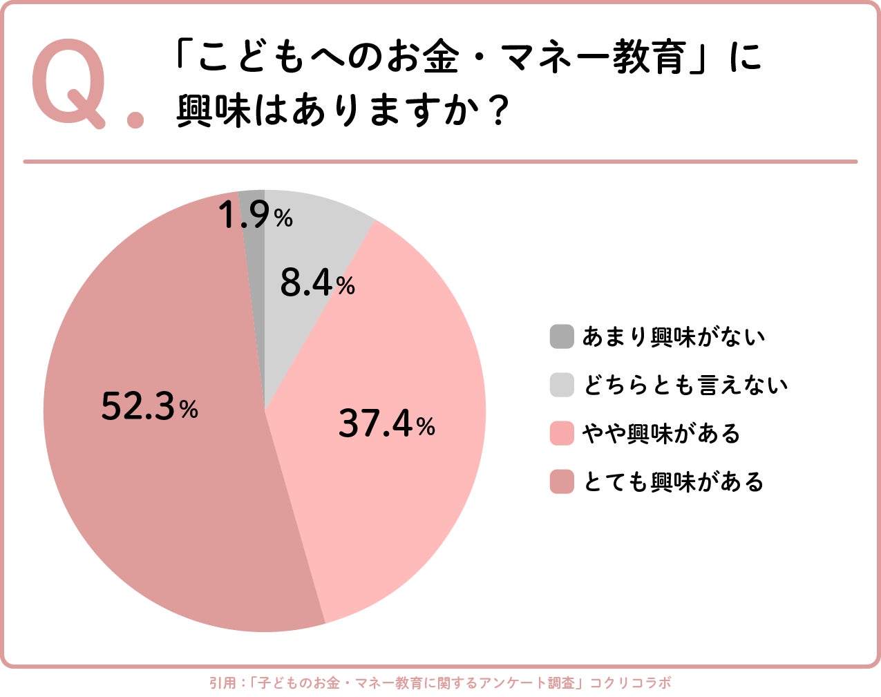 「こどもへのお金・マネー教育に興味はありますか?」という問いに対し、実に半数を超える親が「とても興味がある」と回答。「やや興味がある」と合わせて約9割もの親が、マネー教育に関心を持っているという結果も出ています。