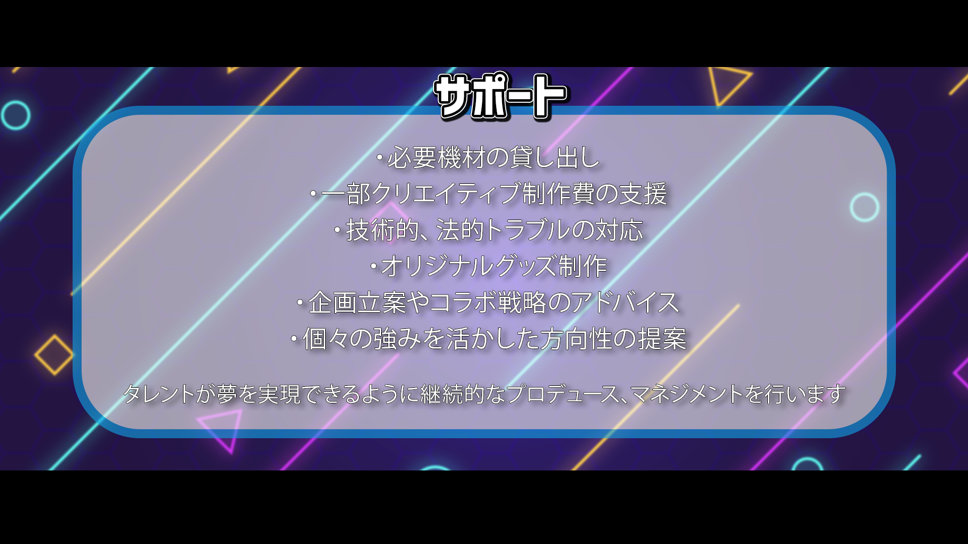 一部クリエイティブ制作費の支援:アバター制作やグラフィックデザイン、歌ってみた関係など、クリエイティブな部分に対して制作費の一部を支援します。