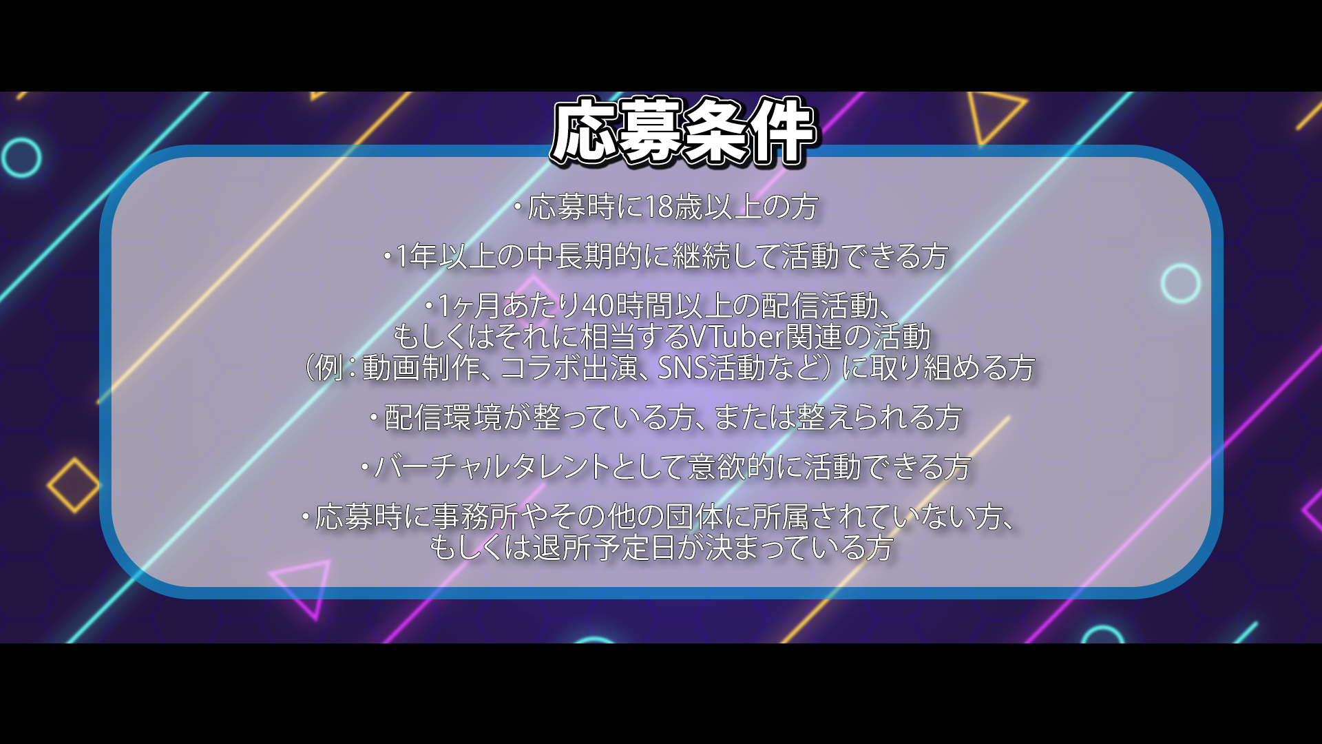 1ヶ月あたり40時間以上の配信活動、もしくはそれに相当するVTuber関連の活動(例:動画制作、コラボ出演、SNS活動など)に取り組める方