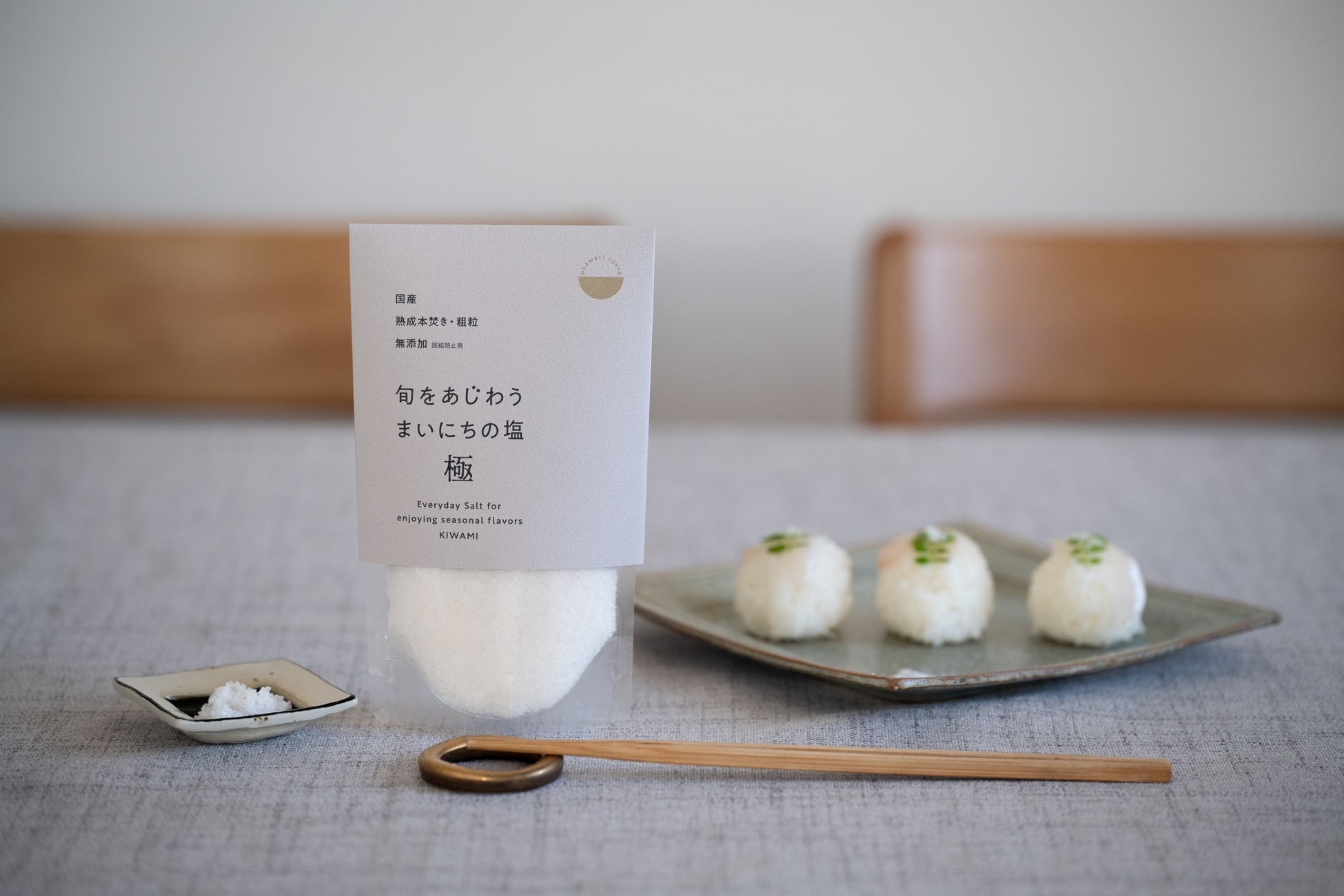 「旬をあじわう まいにち塩」に加え、食感とワンランク上の濃厚な味わいを愉しめるプレミアムな粗塩「旬をあじわう まいにちの塩 極」が誕生しました。職人による2日間の熟成本焚きで、通常のまいにちの塩よりもゆっくりと焚き上げたため、結晶が大きく、雑味が少ないゆえに濃い味わいとザクザクの食感が特徴です。まずは、旬のものにちょこっと添えてお愉しみください。もちろん余計なものは一切加えず、子供から大人まで安心してお召し上がりいただけます。ぜひ、見た目も味わいも存在感のある塩をかけるだけ、添えるだけの料理で、旬の食材本来が持つ旨みを存分に堪能していただければ幸いです。