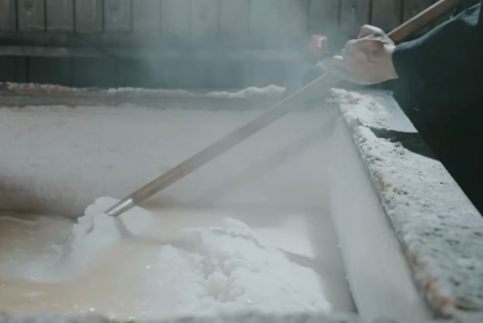 この塩をつくるのは、塩の匠である雄然(ゆうぜん)さん。海のミネラルバランスをそのまま活かした、まさに身体を調える「調身料」のようなお塩を目指しています。塩の匠、独自の工程の中でも一番重要なのは”天地返し”。塩に含まれるミネラルは、カルシウム、ナトリウム、カリウム、マグネシウムなどそれぞれ結晶化するタイミングが異なり、層になって焚き上がります。そのため、まんべんなく天地を返しながら、各種ミネラル成分を混ぜ合わせます。