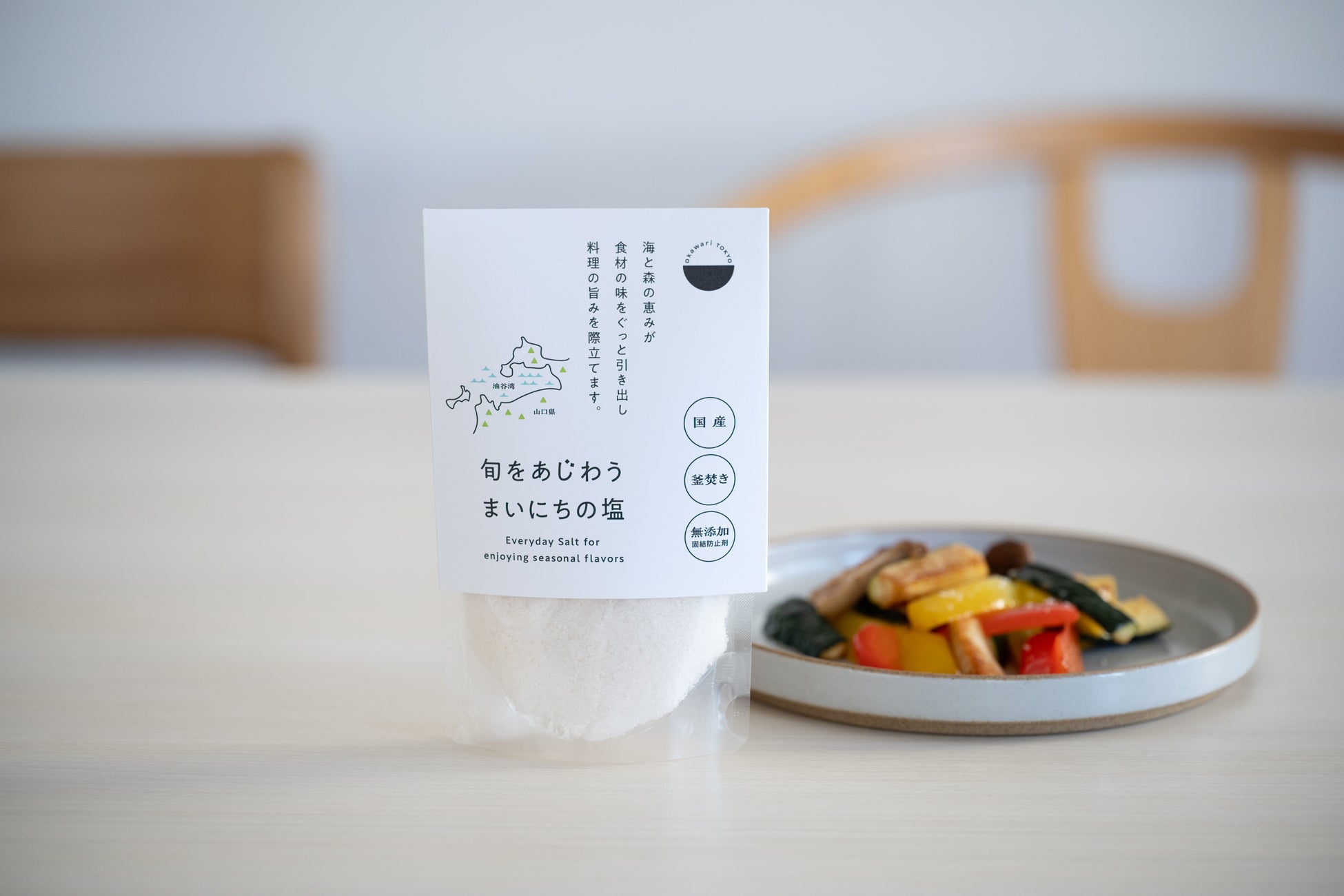 近年、季節が曖昧になってきて日本の文化である四季を楽しむことが難しくなりつつあります。そんな中でも、旬の食材は季節を感じるきっかけとなるもの。「旬をあじわう まいにちの塩」は、四季折々の森と海のエネルギーをそのままに焚き上げ、海水を汲み上げる季節で味わいが変わる、まさに「旬をあじわう塩」です。パッケージデザインはデザインオフィスnendoが監修。カルシウム、マグネシウムのミネラル成分を含み、自然の恵みを活かす製法で、食材が本来もつ味わいを、驚くほどぐっと引き立てます。余計なものは一切加えず、子供から大人まで安心してお召し上がりいただけ、炒め物・煮物などに使うだけで、毎日の料理の旨みが際立ちます。旬の食材とその味を引き立てる塩を通して、改めて季節の移り変わりに目を向けるきっかけになれば幸いです。