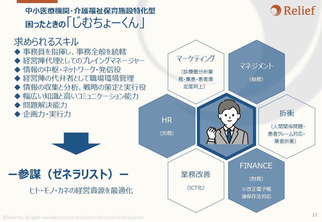 株式会社Relief(本社:愛知県名古屋市、代表:阪本 謙二郎)は、中小医療機関・介護福祉保育施設に特化した事務長アウトソーシング、困ったときの『じむちょーくん』をリリースしました。
