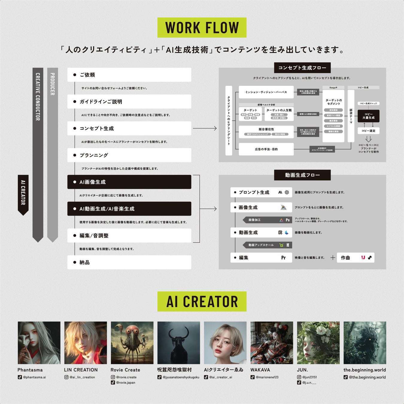映画監督やCMディレクター、アートディレクター、コピーライター、作家、脚本家、ゲームプランナーなど未だAIのクリエイティブに携わったことのないクリエイターと生成AIクリエイターを掛け合わせすことで、新しいエンターテイメントを開発いたします。この度、CMディレクター中島信也氏と映画監督白石和彌氏のオリジナルコンテンツを制作しました。