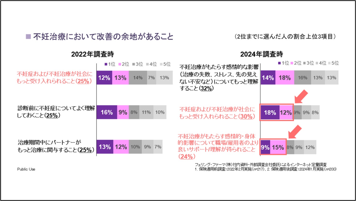 不妊治療に対する職場・雇用者など周囲からの理解やサポートが望まれている 不妊治療において改善の余地があることについて「不妊治療がもたらす感情的な影響について理解すること」を上位2位までに答えた割合が保険適用前後ともに最も多いが、保険適用後は「不妊症や不妊治療が社会にもっと受け入れられること」「職場・雇用者のより良いサポート、理解が得られること」と答える割合が増加しており、より周囲からの理解やサポートが望まれている。