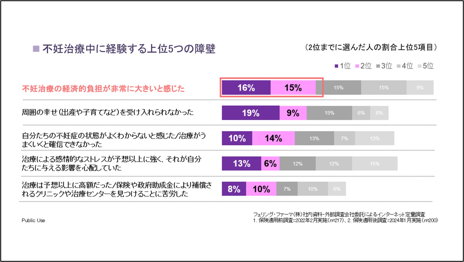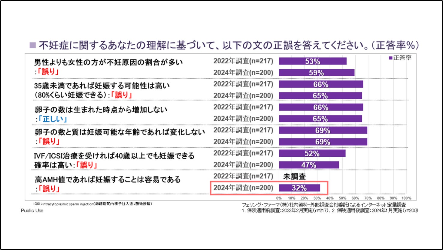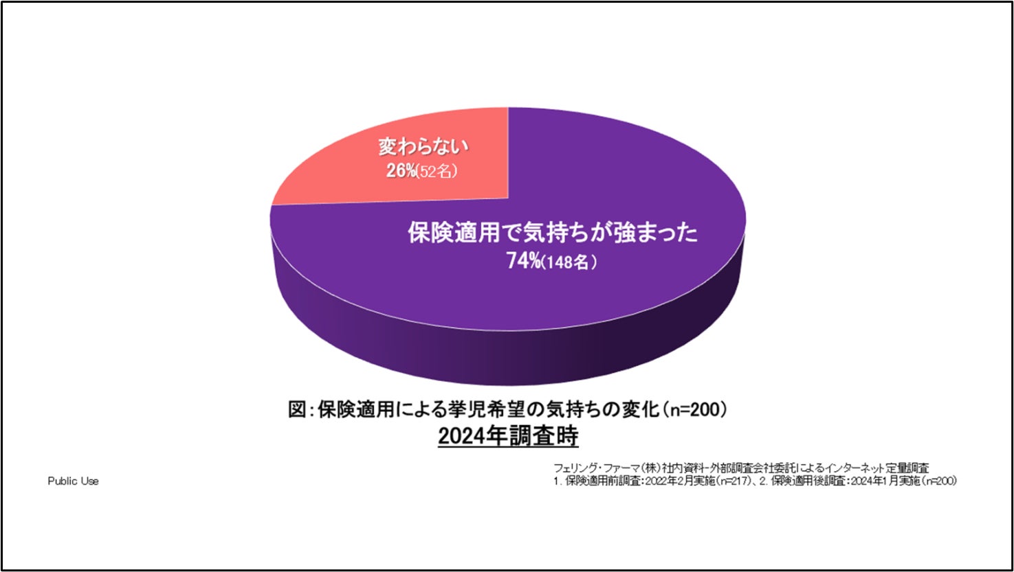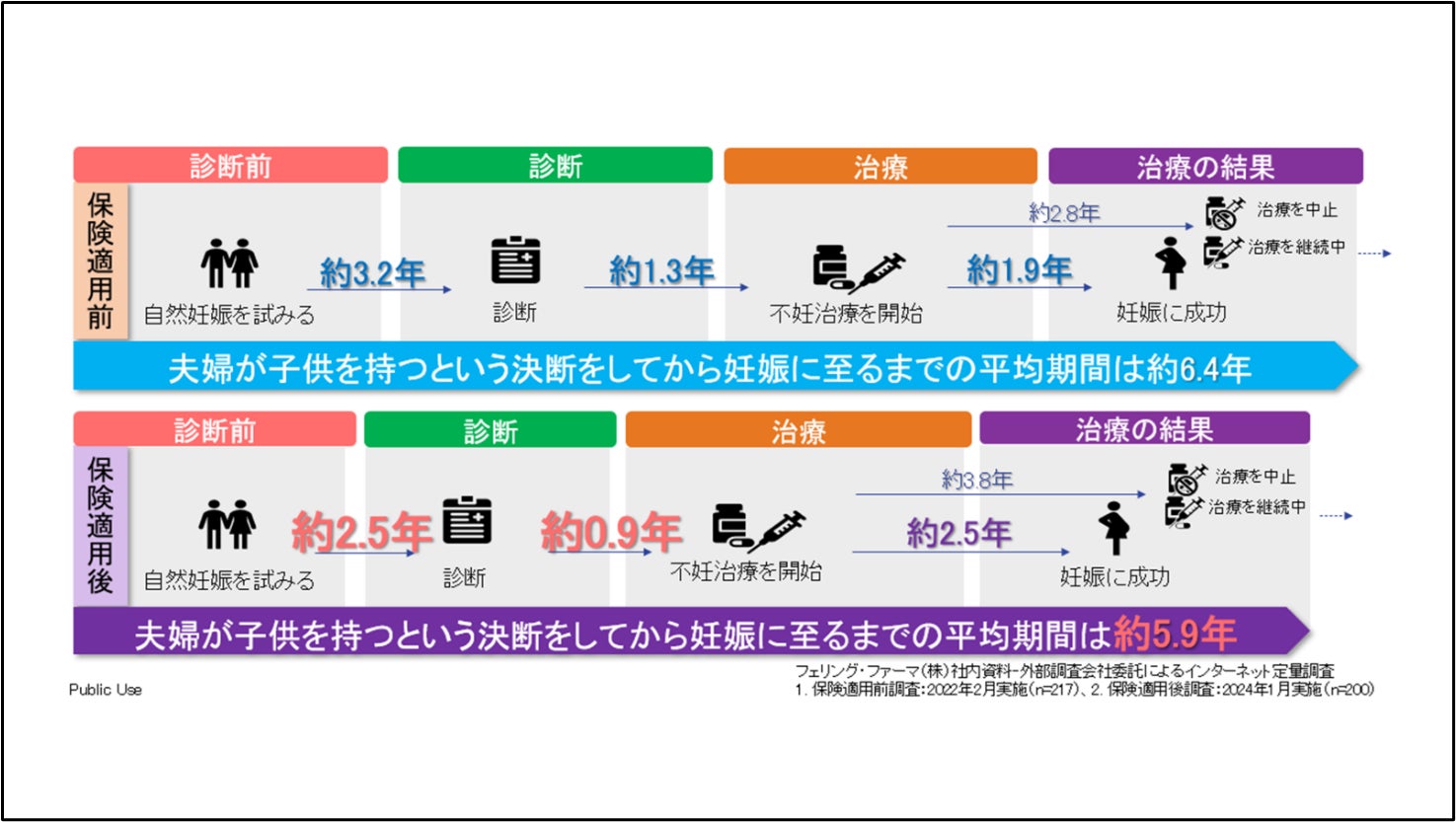 フェリング・ファーマは、日本の不妊治療患者カップルを対象に、「保険適用前後における不妊患者の受診行動に関する調査 <EUREKA Family 2>」を実施しました。2022年4月に不妊治療の保険適用が開始されて2年が経過することを受け、妊娠を望むカップルが不妊症の疾患認知から受診、治療までの時系列での行動、心理状況の変化(ペイシェントジャーニー)を調査し、保険適用の前後で患者さんの行動がどう変容したのか、心理的な葛藤や必要としているサポートが保険適用前後でどう変容したのかを明らかにすることを目的として実施したものです。 フェリング・ファーマは同様の調査を2022年2月にも実施しており、今回の調査は不妊治療が保険適用となって以降、ほぼ同じ質問票を用いた初めての調査となっています。