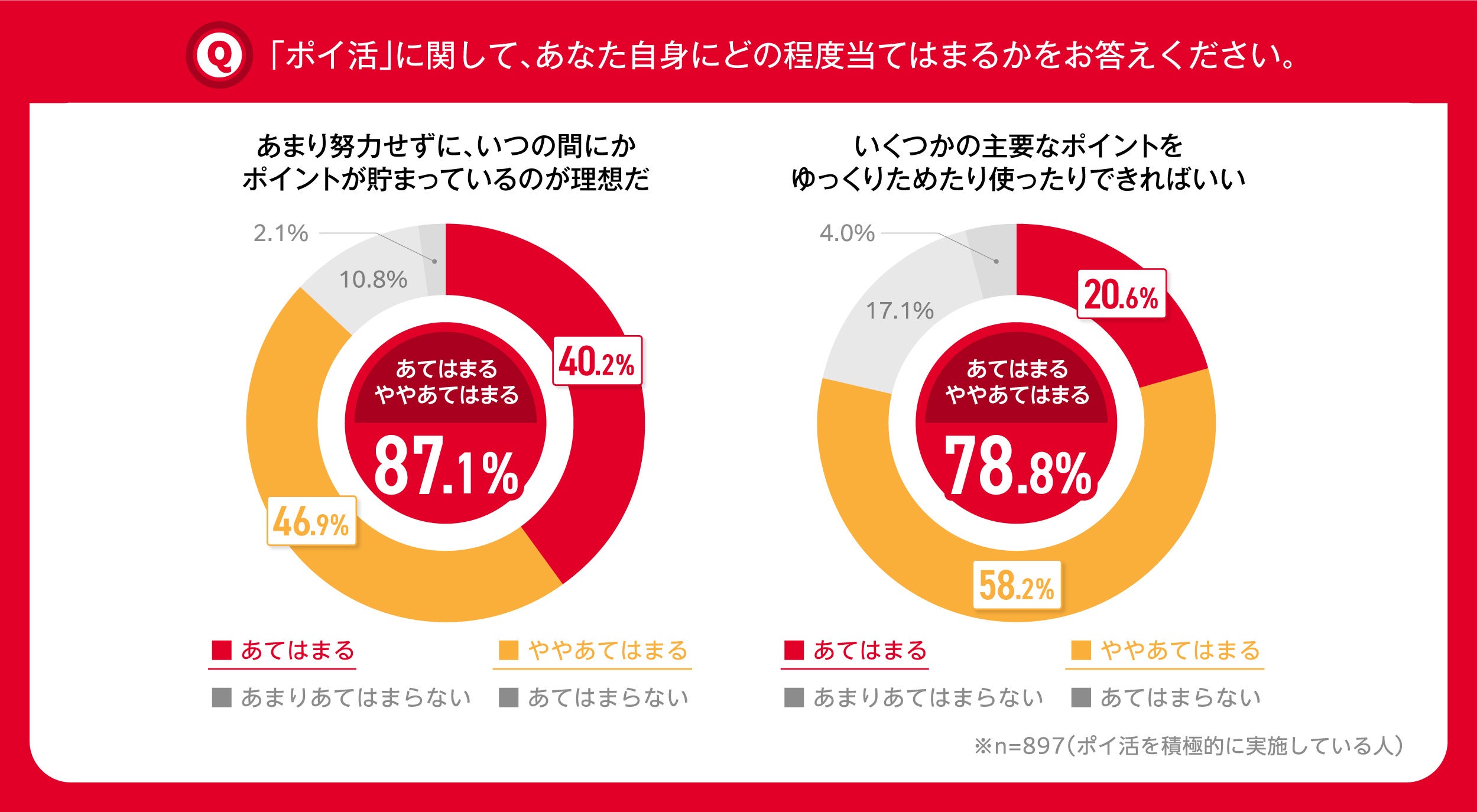 ポイ活ユーザーの意識を調査した結果、「あまり努力せずに、いつの間にかポイントが貯まっているのが理想だ」という回答が87.1%、「いくつかの主要なポイントをゆっくりためたり使ったりできればいい」と回答が78.8%