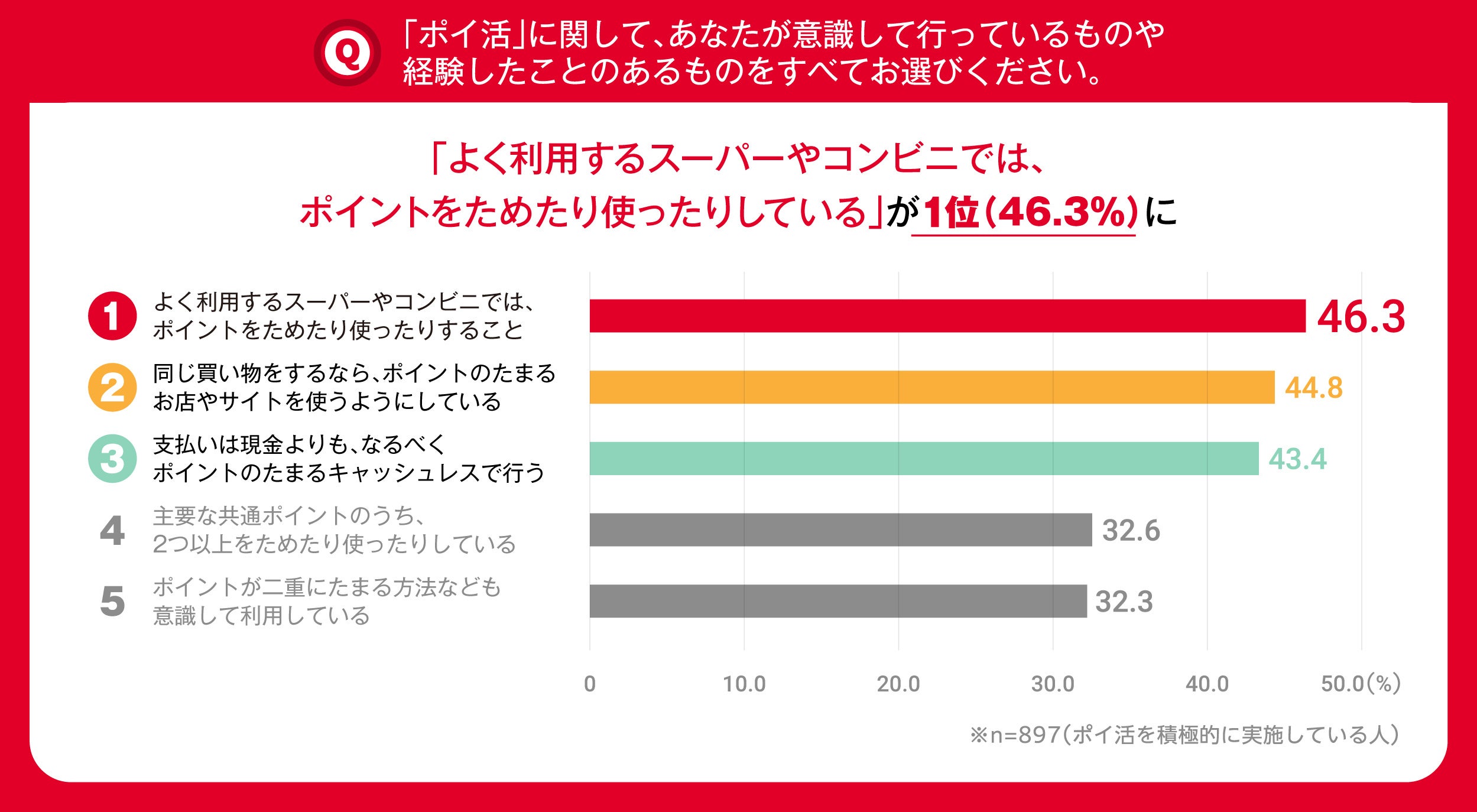 具体的に、意識して行っているポイ活については、「よく利用するスーパーやコンビニでは、ポイントをためたり使ったりしている」が1位となりました。