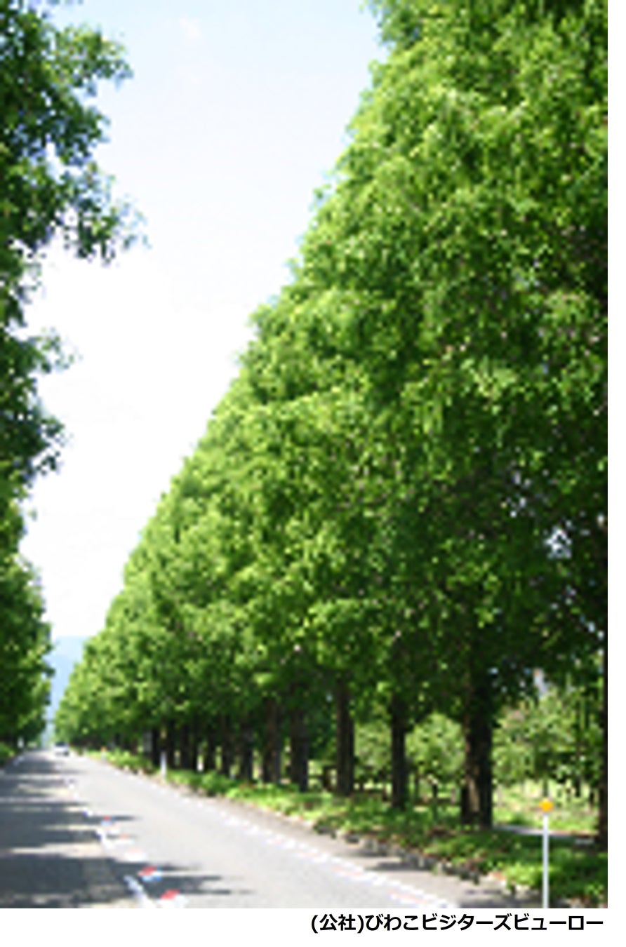 延長約2.4kmにわたってメタセコイアが約500本植えられ、マキノ高原へのアプローチ道を形成しています。秋の紅葉スポットとしても有名ですが、実は夏の新緑も圧倒的。一面緑の景色を満喫することが出来ます。